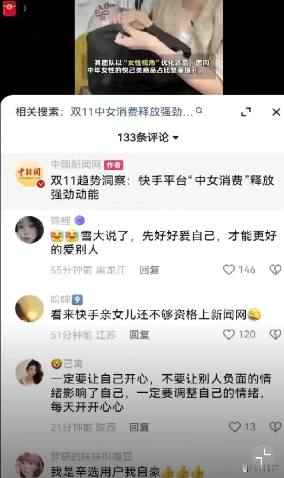 中国新闻网报道辛选以及初瑞雪双十一带货,评论区一致好评! 双11趋势洞察:快手平台“中女消费”释放强劲动能,从辛选初瑞雪双十一数据,看快手平台消费新动向!