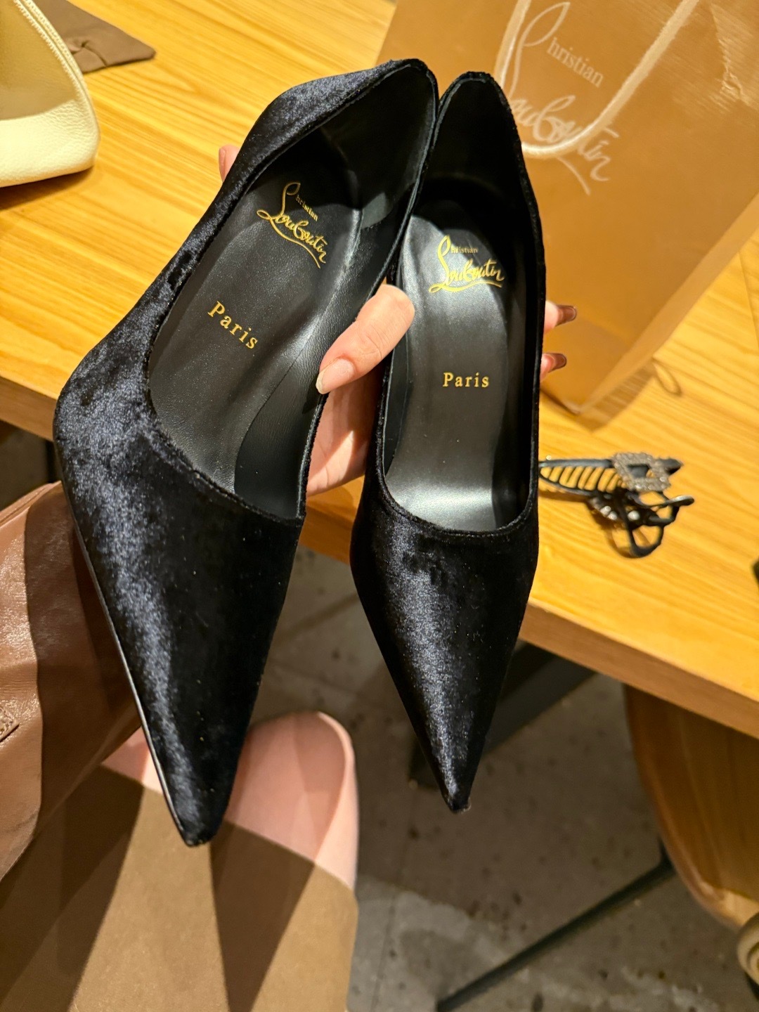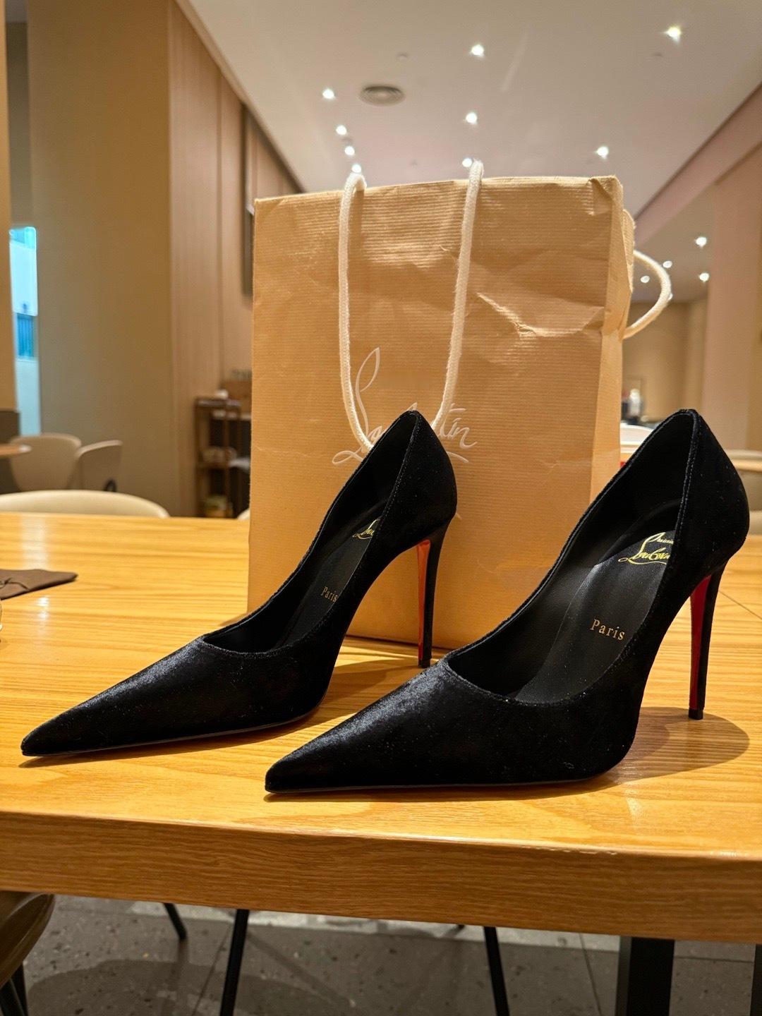 “沒有話要再講”浅黑超薄黑色丝绒CL Kate Max 天鹅绒 尖头套脚 细跟 高跟鞋10cm