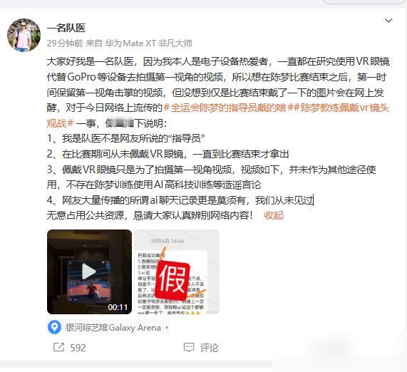 陈梦队医回应戴VR眼镜争议 陈梦队医恳请大家别被带节奏 11月14日,网传“陈梦教练佩戴vr镜头观战”引发热议、当事人@一名队医 发文辟谣:我是一名队医,因为我本人是电子设备热爱者…… 这事闹的。一张图就能编出一部连续剧。队医自己都说了,就是比赛结束想拍个第一视角的击掌视频留念,多简单一事。现在网上传的,简直离谱。 AI训练都出来了。聊天记录更是编得有鼻子有眼。队医挺委屈的,还得专门出来澄清三点:身份搞错了,时间搞错了,用途也搞错了。最基本的事实都没弄清,讨论得再热烈也是白搭。 现在网络信息太快了。快到来不及核实,情绪就跑在了真相前面。看到个“教练戴VR”的标题,很多人第一反应可能就是“有黑科技?”“不公平?”,而不是先去想“这是真的吗”。这种条件反射,才是问题关键。 队医的回应挺诚恳的。说是“电子设备热爱者”,研究用VR代替GoPro,这解释合情合理。换个角度想,要是真有什么秘密训练,怎么可能在公开场合这么显眼地戴出来?逻辑上根本说不通。可惜,很多人只愿意相信他们想相信的“故事”。 被带节奏太容易了。一张截图,几句揣测,就能点燃一场莫须有的争议。最后浪费的是公共资源,消耗的是运动员和团队的精力。队医那句“恳请大家别被带节奏”,听着有点无奈,也说出了很多人的心声。 这事也给所有人提了个醒。看到热点,不妨让子弹先飞一会儿。等等当事人的说法,看看有没有确凿证据。而不是急着站队,急着发泄情绪。冷静一点,网络环境才能清爽一点。 说到底,就是对人和事多一份基本的信任和尊重。别让好奇心和关注度,变成了伤人的利器。真相不需要那么多戏剧性的包装。