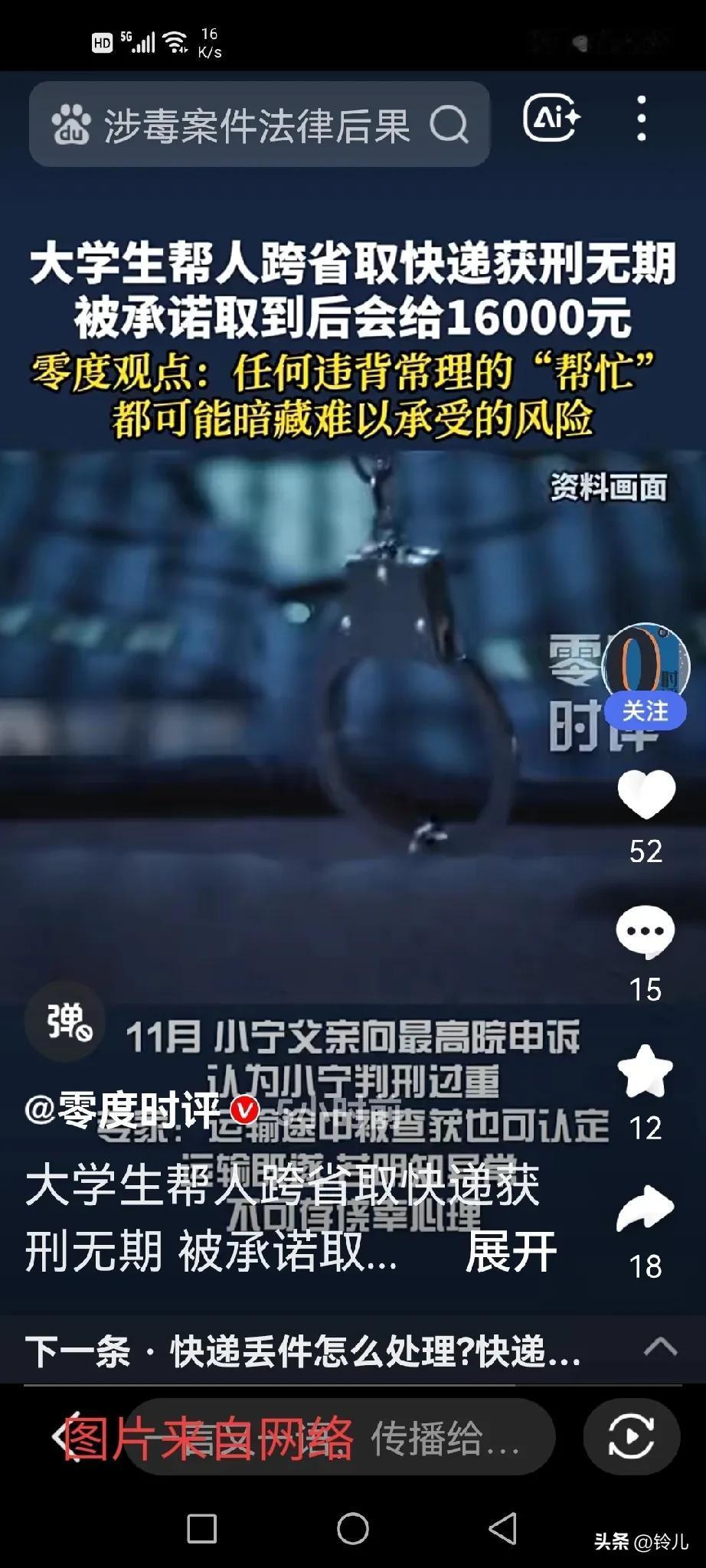 重金之下必有莽夫,见利忘义的无脑大学生走上绝路。 据九派新闻报道,一名21岁大学生小宁帮人跨省取快递却被判无期。好处费是给小宁16000元。快递在途中被警方发现藏有4.4余千克毒品,小宁构成运输毒品罪。 这也是教育缺失,跨省取快递就已经不正常,还给这么多的辛苦费,21岁都没意识到会不会犯法。 大学也要上普法课,如果明知道里面有问题,还会铤而走险,那就是知法犯法存侥幸心理。 这也给青少年敲响了警钟,远离毒品,不要见利忘法。