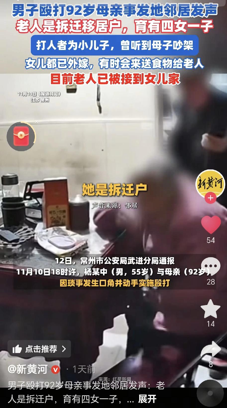 93岁的老母亲被亲儿子拳打脚踢!邻居一句话道出背后隐情:说到底还是钱闹的! 看到这新闻气得手都抖了!50岁的儿子对着九旬老娘挥拳就打,这怎么能是人干出来的事?更让人心寒透顶的是,这家人以前穷得叮当响连饭都快吃不上,拆迁后突然一夜暴富成暴发户,可小儿子做点小生意又亏得一塌糊涂,就把火气全撒到了老母亲身上。最可恨的是全家都惯着他!四个姐姐从小把弟弟当祖宗供着,老母亲也一味纵容,结果倒好,养出个连亲妈都打的白眼狼! 这事儿其实就是给我们敲了个警钟:养孩子不能光给钱砸,更得教他怎么做人!大家说,这种逆子是不是该让他好好反省?