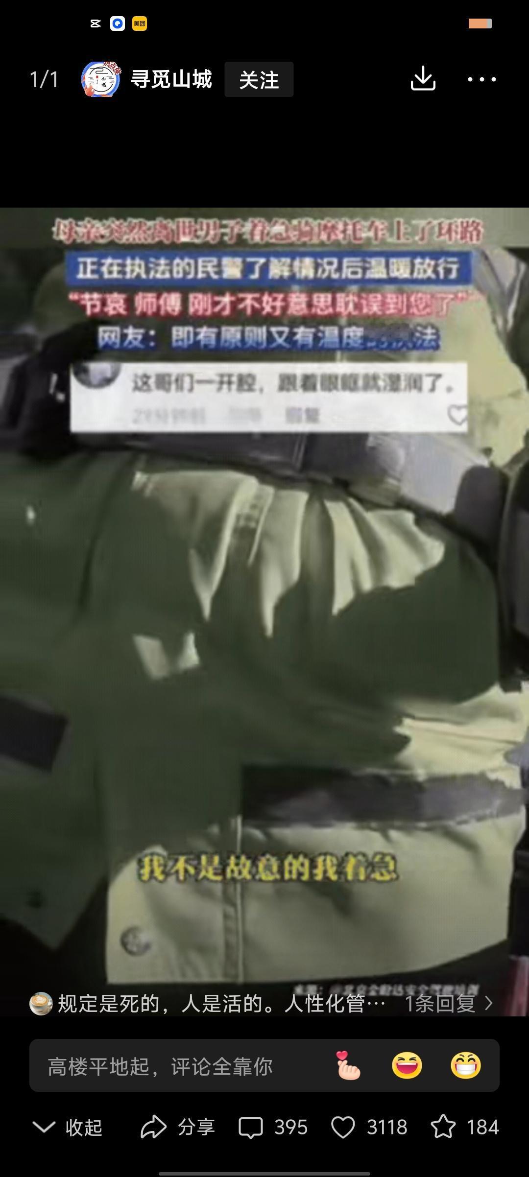 泪目!北京一男子骑摩托上五环,被交警拦下后,男子竟然崩溃大哭:警官,我妈没了!我要看我妈去!我不是故意的我着急!交警听到这话后,到了嘴边的批评立马咽回去,并下意识收回了警棍,询问道:“回哪?” 有网友说:小事不小!把为人民服务落到了实处,北京交警做得好。全国各地交警都应向北京交警学习,一心为人民群众着想,人民群众才会爱戴你,社会才会和谐安宁!向北京交警致敬! 北京交警确实不错!九几年在北京走错路了,交警说外地的车不罚款了还给细心的指了路!很感动 这种做法是错误的。正确的做法是摩托车扣下(执法必严),警察免费用车将此人送到目的地(人性化)。 雨不大淋湿衣裳,话不多暖人心肠,有温度的执法,赋予法律以人文温度,更能让法规内化于心。 人民警察为人民,不是冰冷的执法机器,而是有温度的人民公仆。为人民的好警察点赞。 “法不外乎人情”,我泪目。我母亲八十几岁了往乡下,十几年了晚上手机我不敢关机不敢静音,就怕半夜接电话,每晚睡觉前都要检查手机状况,手机是否开着,音量如何,这样才踏实。 大家怎么看呢?