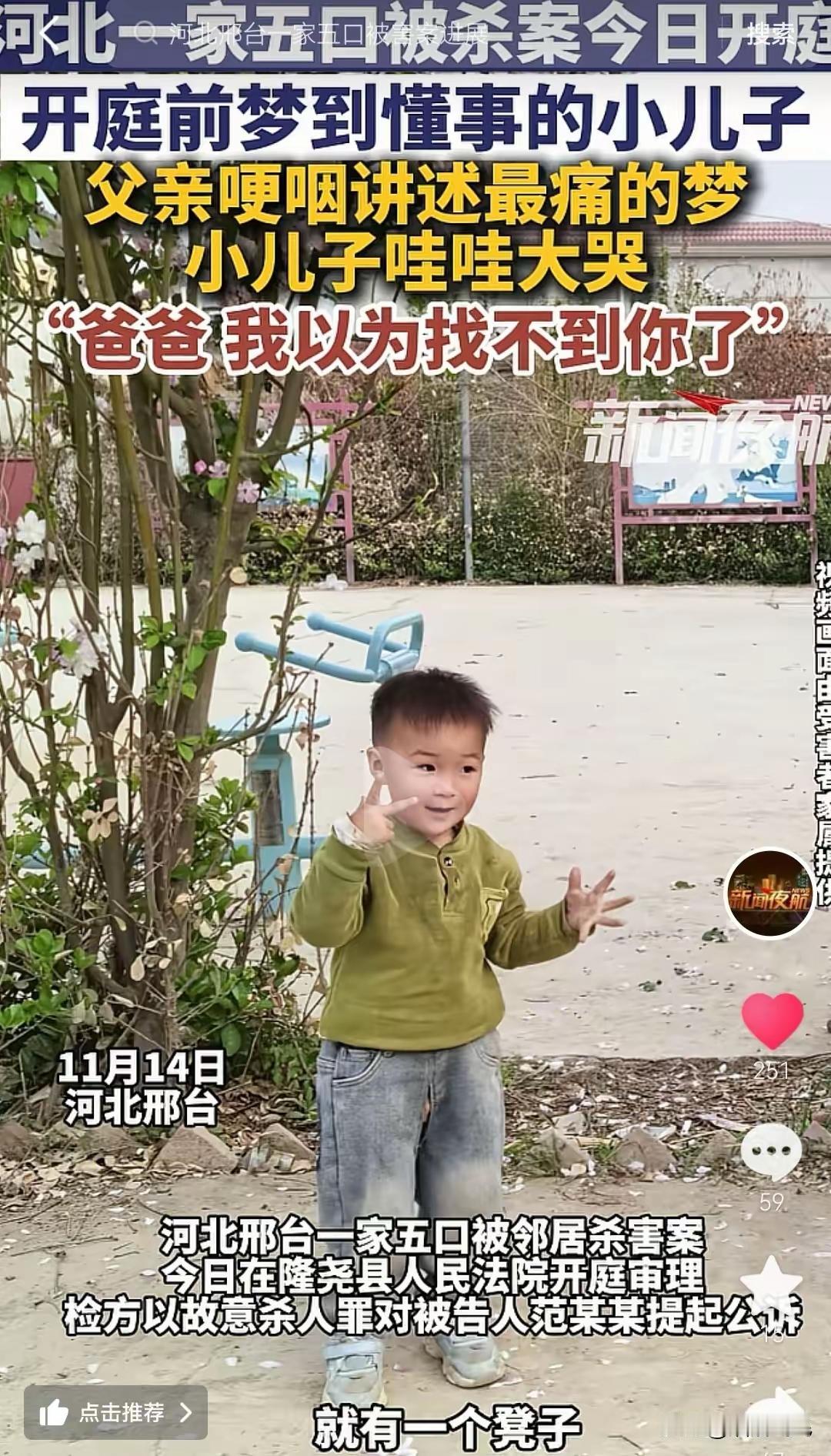 河北一家五口被杀案今天开庭 李先生彻底绷不住了 因为他做梦,梦到了3岁的小儿子。小儿子对他说:“爸爸,我以为找不到你了。”如今阴阳相隔,确实是找不到,梦醒之后,不知道李先生要怎么面对接下来的生活。 李先生的小儿子才3岁,正是什么都不懂的年纪。出事的时候,坐在小板凳上吃东西。可是凶手还是对年幼的他下手。 有网友说:村干部就得管村里的事儿!宅基地纠纷别拖着,能调解的赶紧拉着双方说和,实在谈不拢就赶紧报警,别让小事闹大,这才是该有的担当! 有因就有果,占公很气人的,我家也被占,导致车子进院子很难,也吵了也找村上了,没用,还不是给他们用水泥砌起来了,我们能怎么办,孩子还小,不能做饭鱼死网破,就只能忍。这种事要么忍,要么就像这家一样。 村干部是有责任的,身为村干部要及时调解村民房宅基地纠纷,或者应该报警处理 人与人之间,特别是邻居,人要做到忍字当头,于纠纷不要一针对一线,与事观众也不要光看表面,人人都知道杀人尝命,兔子逼急也咬人。 大家怎么看呢?