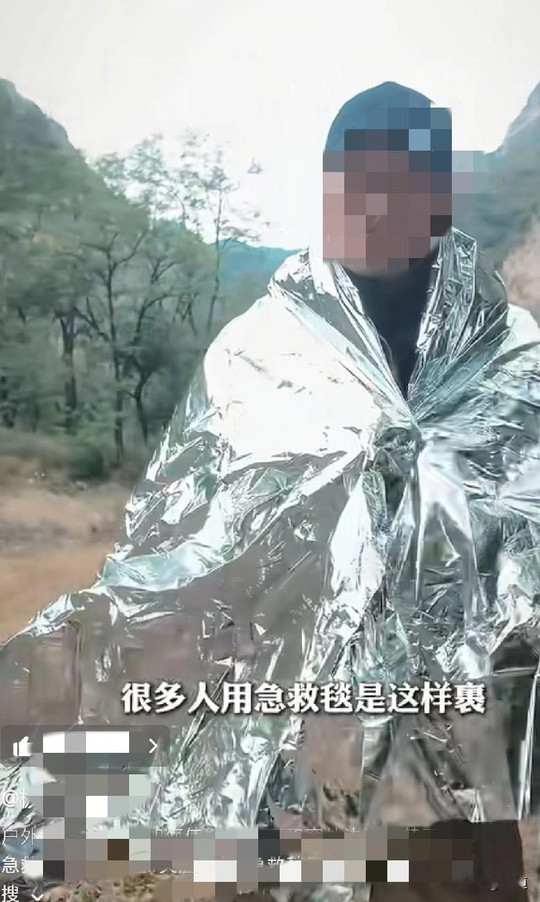我以为的户外应急保温毯是一个羊毛毯,保暖的。 没想到真正的保温毯包装起来就一张卡片大小。 打开就是一张铝箔材质的塑料布,又轻又溥。 连全身都覆盖不住,只能护住头部和胸背部。 而且穿时最好贴身将重要的胸腹背部包裹住,再穿衣服。 因为如果衣服穿在里面,出的汗排不出去,会将衣服浸温,反而不保温了。 而且也只是暂时保温一会儿,时间长了也是不行。 这玩意儿谁发明的?还不如买一块塑料布往背包里一装呢,至少能防雨。
