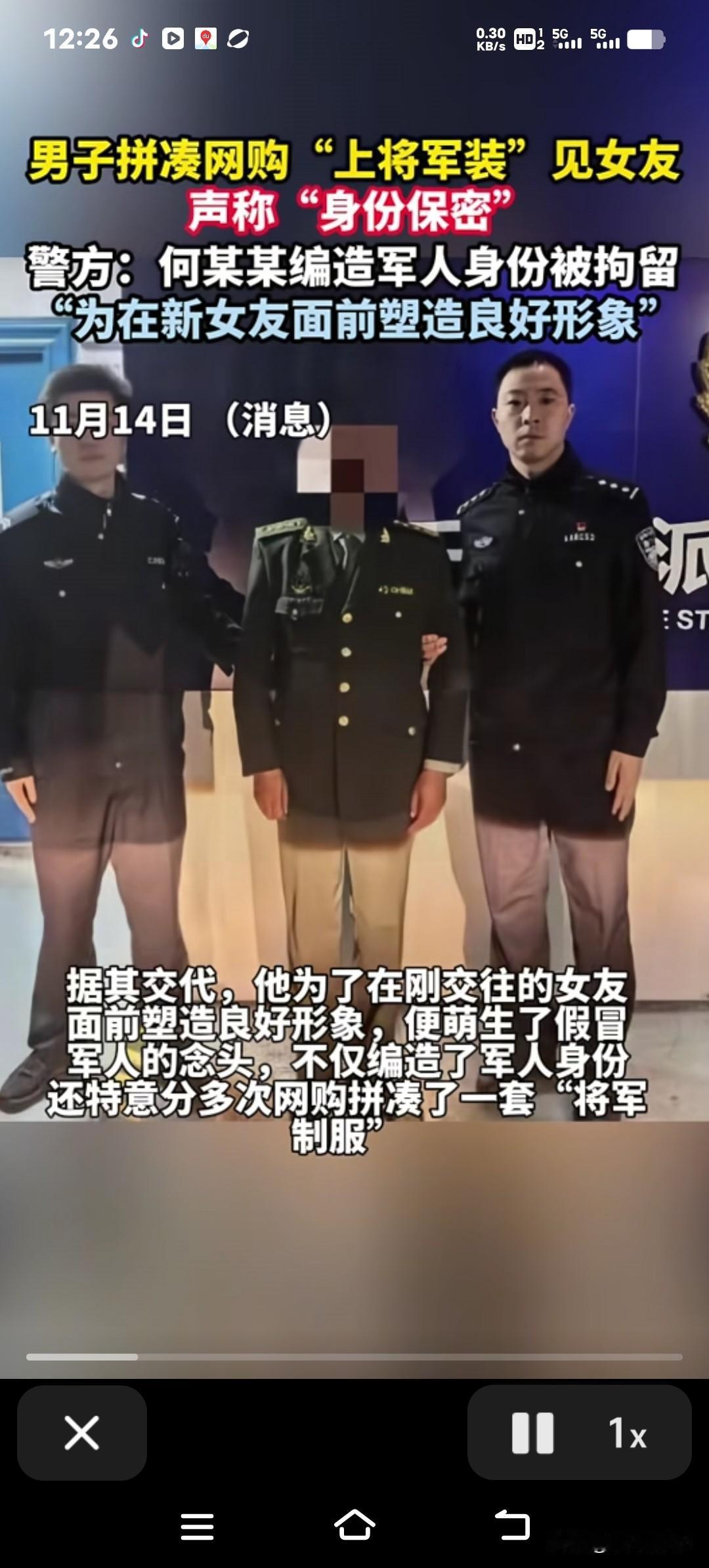 网购“上将军装”去见女友?这操作也太秀了吧! 最近,淳安高铁站来了位“将军”,穿的军装一看就不对劲,全是破绽。民警走过去问他情况,这男的支支吾吾说自己“身份比较特殊,不方便透露”,结果当场就被看出来了。 后来才知道,他就是想在刚处的女朋友面前撑面子,特意在网上买了假军装冒充军人,连肩章的样式都搞错了。 更逗的是,他还特意挑了“一大队”和“熊猫”的刺绣图案,以为这样就能蒙混过去。等他女朋友知道了真实情况,估计心里都在后悔,肠子都快悔青了。最后,这男的因为冒充军人和警察,被拘留了8天。 想靠装出来的身份谈恋爱?这招可能能骗一时,但绝对骗不了一辈子!感情这东西,得靠真心,不是靠演出来的戏码。大伙儿找对象的时候,可得把眼睛擦亮点儿! 你身边有没有人试过这种“装身份”的操作?最后都怎么样了?