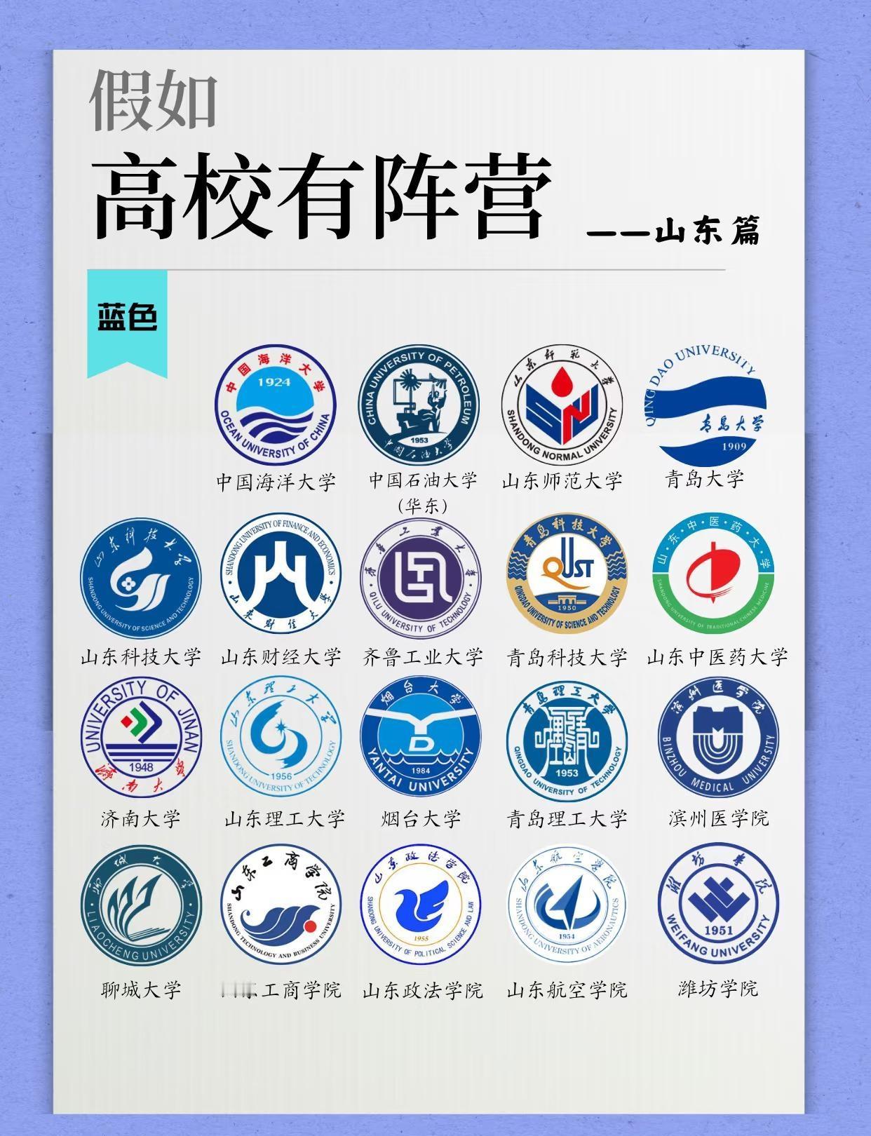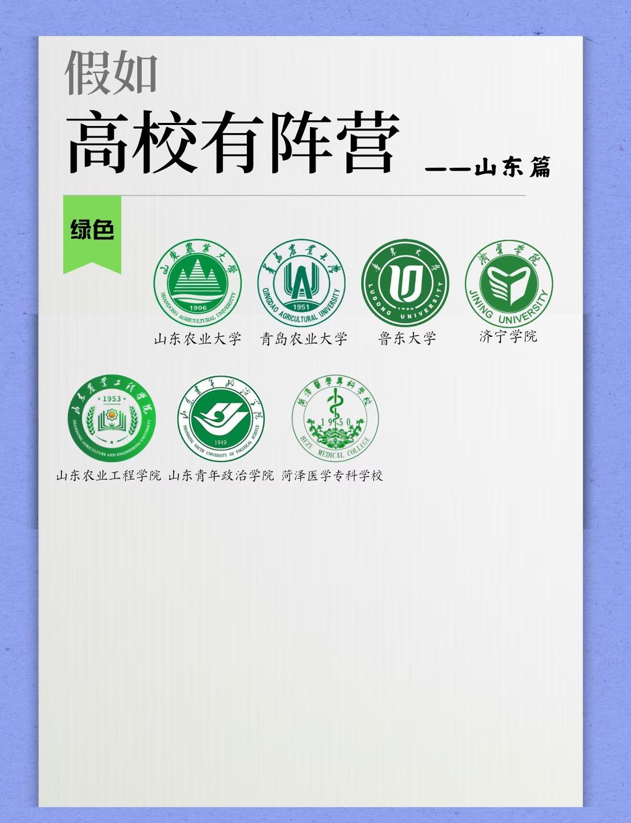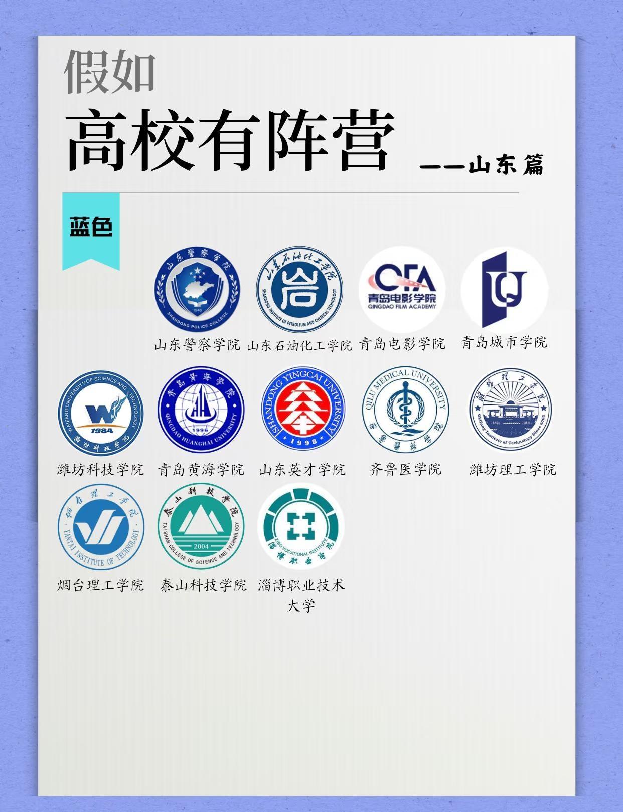 假如高校有阵营(山东篇) 假如山东高校按校徽颜色分阵营, [机智]蓝、红、绿三大阵营各展所长—— [惊喜]红色阵营的山东大学作为“985”重点高校 以深厚的学术底蕴在文史、医学和材料科学等领域成就卓著 [赞]蓝色阵营的中国海洋大学,海洋科学、水产养殖等特色学科实力显著 积极服务海洋强国战略 同属于蓝色阵营的淄博职业技术大学,为今年新晋本科选手 作为山东首所公办职业本科,该校以就业为导向 与900余家企业深度合作,通过"订单班"等模式培养实践型人才 毕业生深受企业欢迎,企业满意度稳定在95%以上,就业率达97% 绿色阵营的山东农业大学深耕农学与植物保护领域 为齐鲁大地的乡村振兴和农业发展提供了有力支撑 ...... 淄博职业技术大学 山东大学 中国海洋大学 中国石油大学 山东农业大学 大学 高校 向往的大学