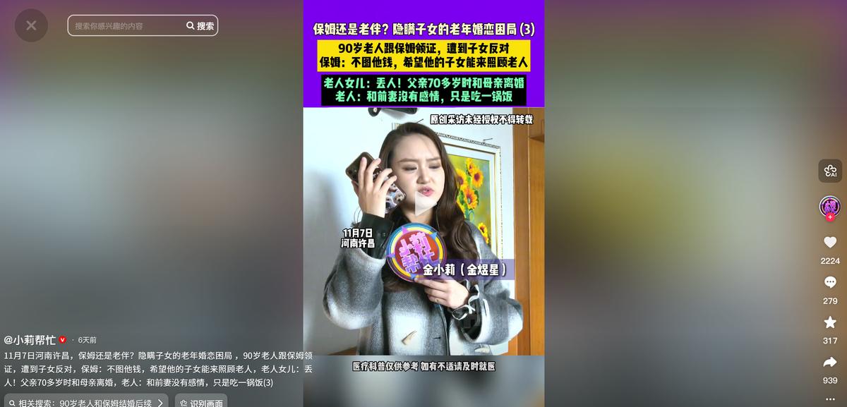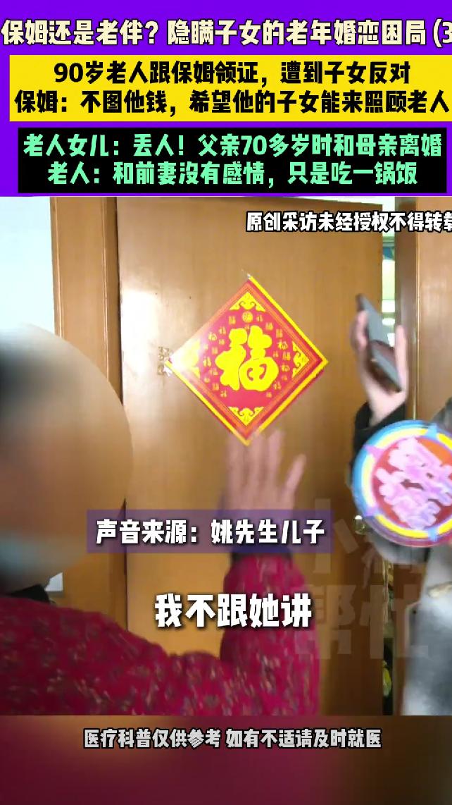 河南许昌,90岁大爷生活无法自理,儿女给他请了位住家保姆,每月1600元。刚开始一切顺利,可一年之后,老人儿女发现父亲竟然和保姆偷偷领了结婚证,儿女瞬间气炸,也不再给她结算工资。谁知保姆说老头非要领的,她啥也不图,对于截然不同的两人说法,大爷站出来表示:她是个好人,我想和她过到底。 河南许昌最近出了件事儿,把一个家庭搅得鸡飞狗跳,说起来也挺让人唏嘘 90 岁的姚大爷,居然瞒着儿女,跟照顾他一年多的住家保姆偷偷领了结婚证,儿女知道后当场气炸,二话不说就停了保姆的工资,好好的雇佣关系,一下子变成了剪不断理还乱的家庭矛盾。 姚大爷早年就离异了,年纪大了之后身体越来越差,生活根本没法自理,穿衣吃饭、洗漱翻身都得靠人照顾,他的儿女都在外地工作,平时很少回家,只能想着请保姆来照看父亲的日常,可前后找了六个保姆,不是嫌活儿累,就是觉得照顾老人麻烦,没一个能坚持下来的,最短的没干满一个月就走了。 直到王阿姨来应聘,这事才算有了着落,王阿姨话不多,性格挺沉稳,做事却格外仔细,就这么日复一日地照顾,转眼一年多过去了,姚大爷对王阿姨越来越依赖,也越来越认可。 他觉得自己虽然有儿女,可他们常年不在身边,是王阿姨不分昼夜地陪着自己,把自己照顾得妥妥帖帖,让他不再觉得孤单,所以他心里悄悄做了个决定,要和王阿姨领证结婚,让她名正言顺地陪自己走完最后一段路。 他没跟任何儿女商量,自己拿着身份证,坚持拉着王阿姨去了民政局,就这么领了结婚证,姚大爷说,自己头脑清楚得很,知道自己在做什么,他就是认定王阿姨是个好人,想跟她好好过日子。 没过多久儿女们因为有事回了趟家,一进门就发现了这张红彤彤的结婚证,瞬间就炸了锅,在他们看来,父亲都 90 岁了,王阿姨跟他领证,肯定是没安好心,图的就是父亲名下的房子和每个月的退休金,儿女们心里头又气又急,觉得王阿姨是处心积虑算计老人的财产,当场就跟父亲吵了起来,还立刻停了王阿姨的工资,说以后再也不会给她发一分钱。 面对儿女的指责王阿姨显得有些委屈,她解释说领证这事儿不是自己提出来的,是姚大爷一直坚持,非要跟她领,她实在拗不过才同意的,自己真的啥也不图,就是想好好照顾老人。 一边是儿女们笃定保姆图谋不轨,一边是保姆矢口否认自己有私心,两边各说各的互不相让,就在这僵持不下的时候,姚大爷站了出来,态度特别坚决地替王阿姨说话,反复强调:“她是个好人,把我照顾得很好,我想和她过到底,你们别为难她。” 老人的话虽然说得平静,却透着一股不容置疑的执着,看得出来他是真的认可王阿姨,也真心想和她相伴晚年。 事情闹到这一步,邻里街坊都知道了,社区工作人员也主动上门调解,记者也来了解情况,王阿姨为了证明自己的清白,主动提出可以签一份协议,明确表示自己放弃所有财产的继承权,不管是姚大爷的房子还是存款,她都分文不要,她还说如果儿女们愿意回来亲自照顾姚大爷,她可以马上就走,之前没结算的工资也不用给了,她图的从来不是钱,就是觉得老人可怜想好好照顾他。 可儿女们一开始态度还是挺强硬的,儿子姚建军甚至撂下话:“她要是非要留下也行,工资别再提了,想拿钱没门。” 不过冷静下来之后,看着父亲坚定的态度,再想想自己确实没法长期留在家里照顾老人,儿女们也开始有些动摇了。 最后经过反复沟通调解,双方终于达成了一致,王阿姨自愿签下了字据,明确申明姚大爷名下的房产以后完全归他的儿女所有,她不会以配偶的身份主张任何财产权利,而且之后也不再领取工资,而姚大爷今后所有的生活开销,包括衣食住行、看病吃药的费用,都由儿女们共同承担。 看到这个结果,一直紧绷着脸的姚大爷终于露出了笑容,高兴得合不拢嘴,家里的气氛也总算缓和了下来,经过这一茬事儿,姚大爷的儿女们也开始反思自己。 女儿姚小丽后来感慨,以前总觉得自己在外打拼赚钱,给父亲请保姆、寄生活费就是孝顺了,却从来没考虑过父亲内心的孤独,他真正需要的不是钱,而是有人陪伴、有人关心的温暖。 其实这事也给很多有类似情况的家庭提了个醒,家里有年迈的老人,尤其是生活不能自理、子女又不在身边的,老人的晚年生活不光需要物质上的保障,更需要情感上的陪伴和关爱。 (信息来源:小莉帮忙)