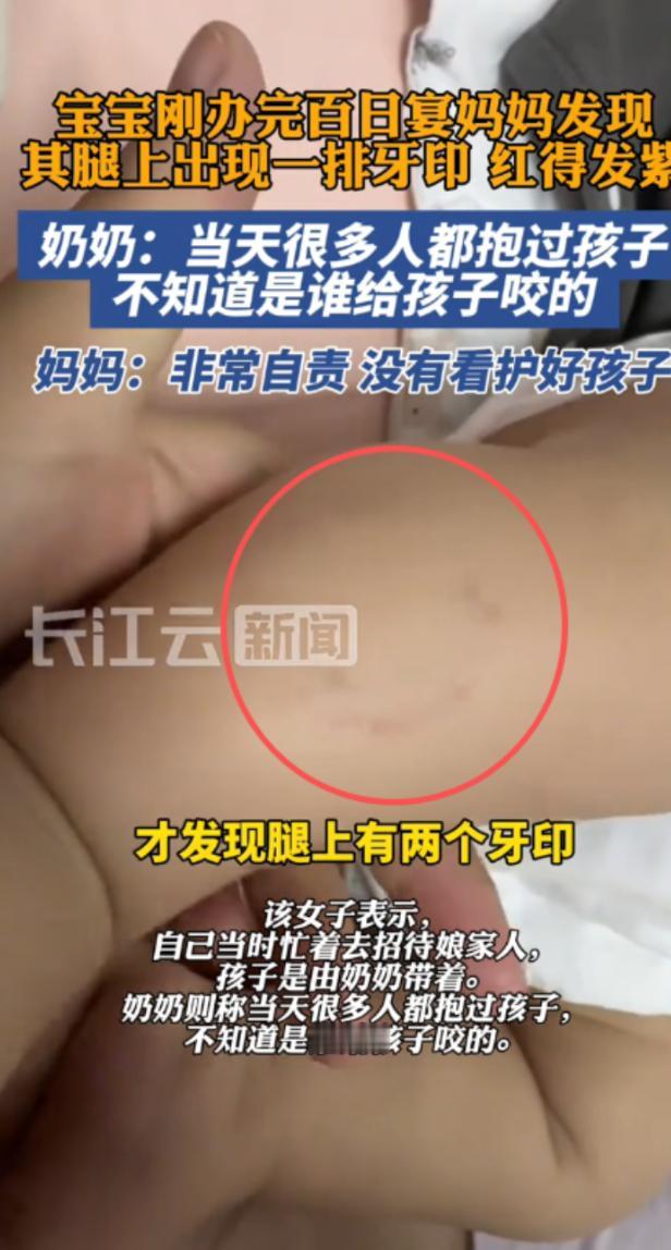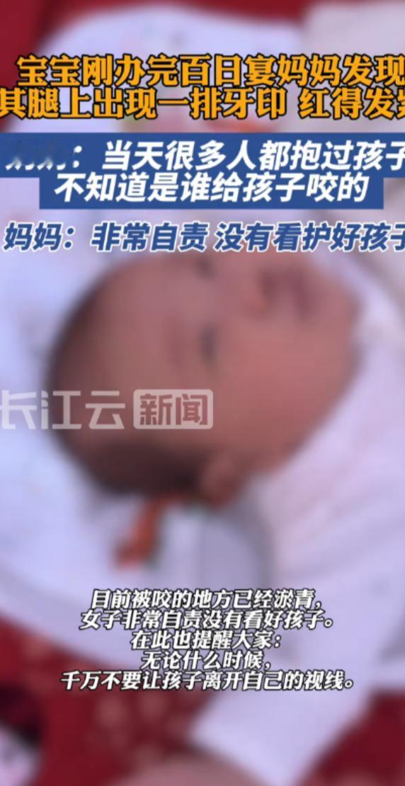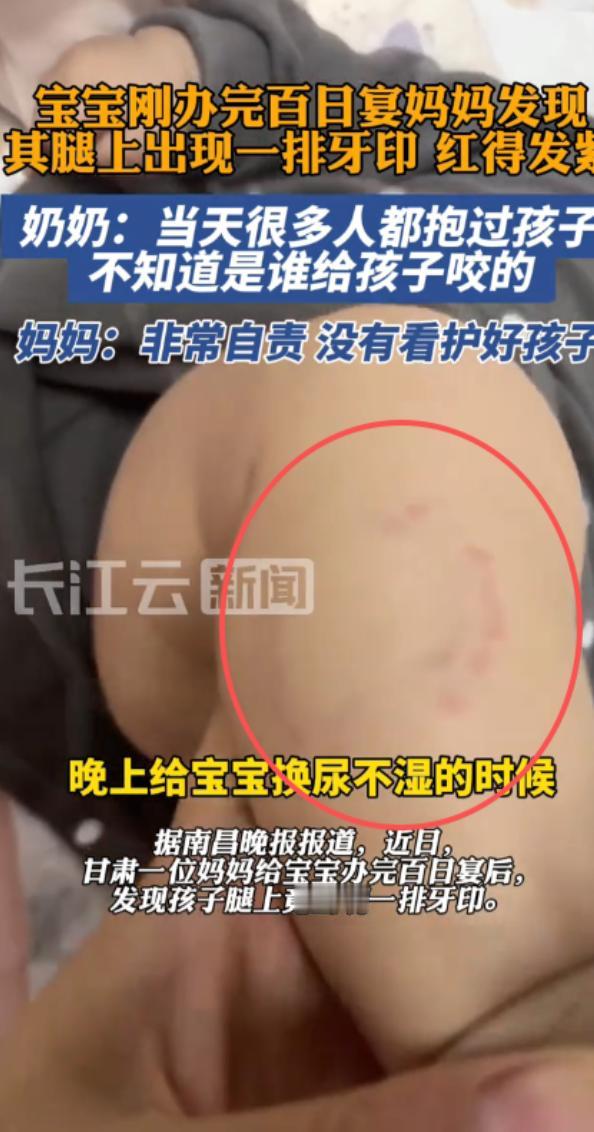 “离了个大谱!”11月10日,甘肃,一女子给孩子办百日宴,由于来的宾客太多,她就将孩子交给婆婆照看,自己去招待娘家人去了。可到了晚上给孩子换尿不湿时,女子发现孩子腿上竟有2个牙印,不知道被谁给咬了!网友:这是什么习俗? 离了个大谱!最近甘肃发生的一件事,让网友们看完直呼 “刷新三观”,好好的百日宴,最后闹得又心疼又气愤,真的想不通到底是谁能干出这种事! 11 月 10 日,甘肃的一位宝妈特意给三个月大的宝宝办了百日宴,为了庆祝孩子健康成长,她早早预订了当地的饭店,邀请了双方的亲朋好友,足足坐了好几桌,当天店里张灯结彩,宾客们脸上都挂着笑容,说着祝福的话,宝妈心里又暖又开心,忙前忙后招呼着大家。 因为来的客人实在太多,宝妈分身乏术,娘家的亲戚们远道而来,她得专门陪着说话、招待,实在顾不上照看孩子,想着婆婆一直细心,平时也常帮着带娃,她就放心地把宝宝交给了婆婆,让婆婆在一旁照看着,自己则去应酬亲友,婆婆也满口答应,抱着宝宝坐在角落的座位上,时不时给孩子拍一拍、哄一哄。 宴席热热闹闹地进行了大半天,宾客们酒足饭饱后陆续散去,宝妈送走最后一批客人,才松了口气,拖着疲惫的身子和婆婆一起回了家,到了深夜宝宝哭闹起来,宝妈像往常一样准备给孩子换尿不湿,可当她轻轻掀开宝宝的裤子时,眼前的一幕让她瞬间浑身发凉,心一下子揪紧了,宝宝白嫩的小腿上,赫然印着两个清晰的牙印,周围还有一圈淡淡的淤青看起来格外刺眼。 宝妈当时就慌了,赶紧仔细检查宝宝的其他地方,还好只有腿上这一处伤口,但那两个牙印深深浅浅,一看就是被人用力咬过的,她又心疼又愤怒,赶紧叫醒身边的婆婆,婆婆看到牙印后也懵了,一脸难以置信,反复念叨着 “怎么会这样?怎么会这样?” 事后追问起来,婆婆才慢慢回忆,当天宴席上太乱了,亲戚朋友一波又一波地过来逗孩子,你抱一会儿我抱一会儿,大家都围着宝宝说可爱,她忙着递水、回应客人,根本顾不过来盯着每一个人。 尤其是后来人越来越多,好多不常联系的远房亲戚也凑过来抱孩子,她实在记不清到底谁抱过、谁碰过孩子的腿,更不知道是谁竟然下嘴咬了孩子。 宝妈看着宝宝腿上的牙印,心里又悔又恨,责怪自己不该因为忙着招待客人就把孩子交给婆婆,要是自己一直守着,肯定不会发生这种事,婆婆也红着眼眶自责,说自己没看好孩子,对不起宝宝,好好的百日宴,本该是满是祝福的日子,却因为这突如其来的伤害,蒙上了一层阴影。 这事被宝妈发到网上后,瞬间引发了全网热议,网友们清一色地喊着 “离了个大谱!”“这是什么操作?” 还有人疑惑地问 “难道这是什么地方习俗?也太吓人了吧!” 大家实在无法理解,面对一个才三个月大、软乎乎的小婴儿,到底是谁能狠心下嘴咬? 有人猜测可能是宴席上其他的小朋友,不懂事觉得宝宝的腿好玩,就无意间咬了一口,也有人觉得,说不定是哪个成年人 “逗孩子” 没了分寸,一时糊涂做出的奇葩行为。 但不管是哪种情况,大家都一致认为,这行为太过分了,婴儿的皮肤那么娇嫩,轻轻一碰都可能红一片,更何况是用力咬,不仅疼还存在很大的健康风险。 网友们纷纷提醒宝妈:“赶紧带孩子去医院检查!成年人嘴里细菌多,万一伤口感染了怎么办?还得排查有没有传染病,千万不能大意!” 还有人愤怒地说:“就算是开玩笑,也得有底线吧?咬婴儿算怎么回事?这根本不是逗孩子,是伤害!” 这位宝妈事后也下定决心,以后不管去哪里,再也不会让孩子离开自己的视线,哪怕再忙再累,也要亲自守着孩子,毕竟孩子的安全永远是第一位的,任何庆祝和人情世故,都不能以牺牲孩子的安全为代价。 爱护孩子是每个成年人的责任,就算不喜欢,也请不要伤害;就算是 “逗孩子”,也得有分寸、守底线,毕竟再小的孩子,也值得被温柔对待,而不是遭受这种莫名的伤害,想想那两个印在婴儿腿上的牙印,真的让人觉得又离谱又心寒! (信息来源:《宝宝百日宴后腿上出现咬痕淤青 妈妈自责没看护好孩子》半岛晨报)