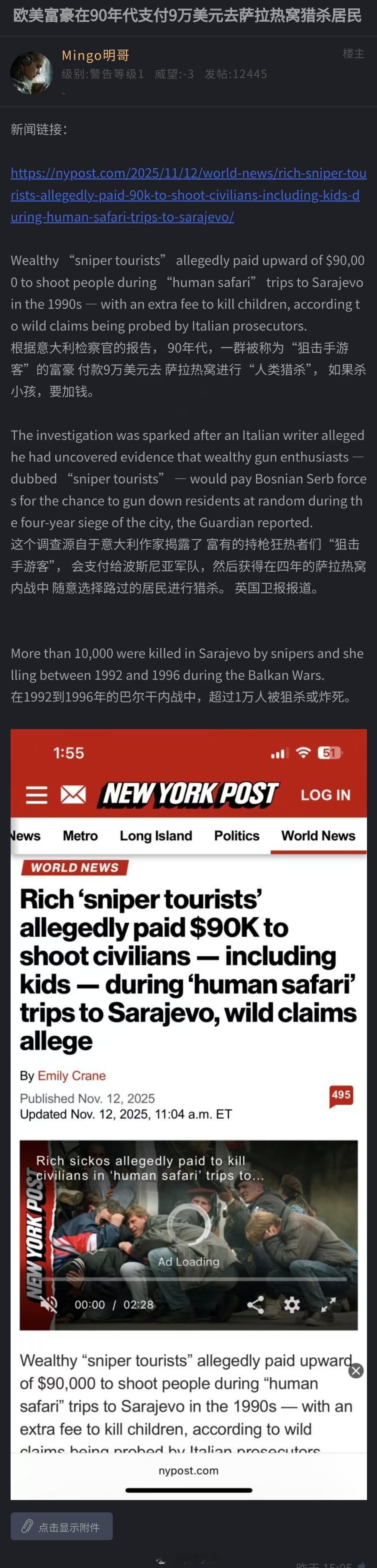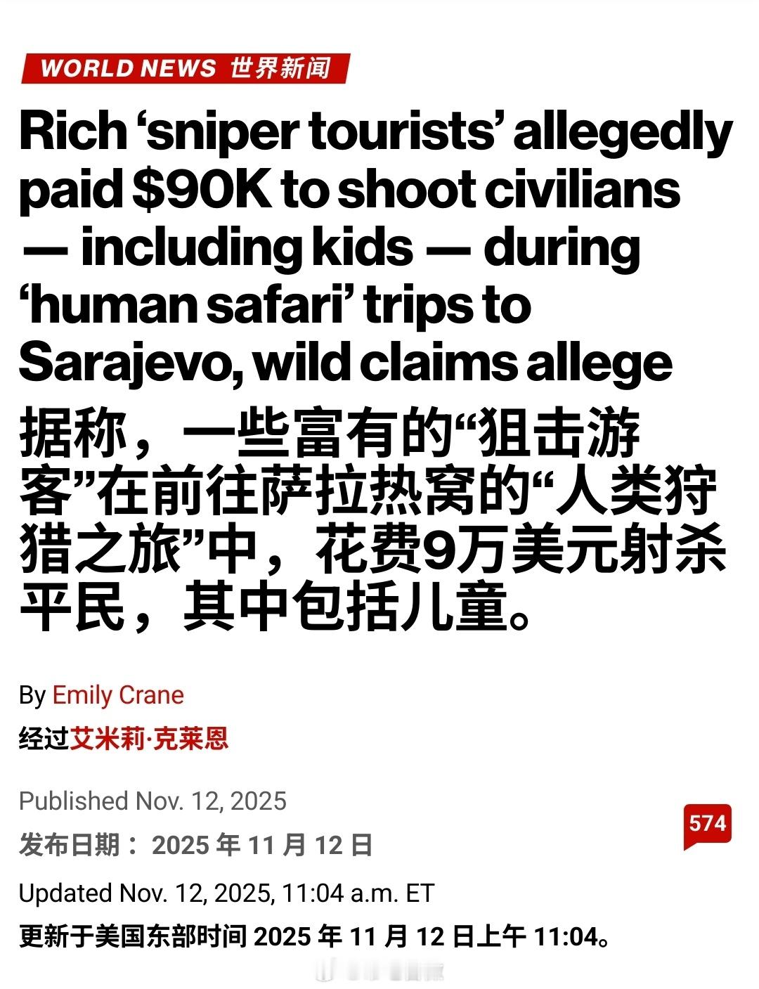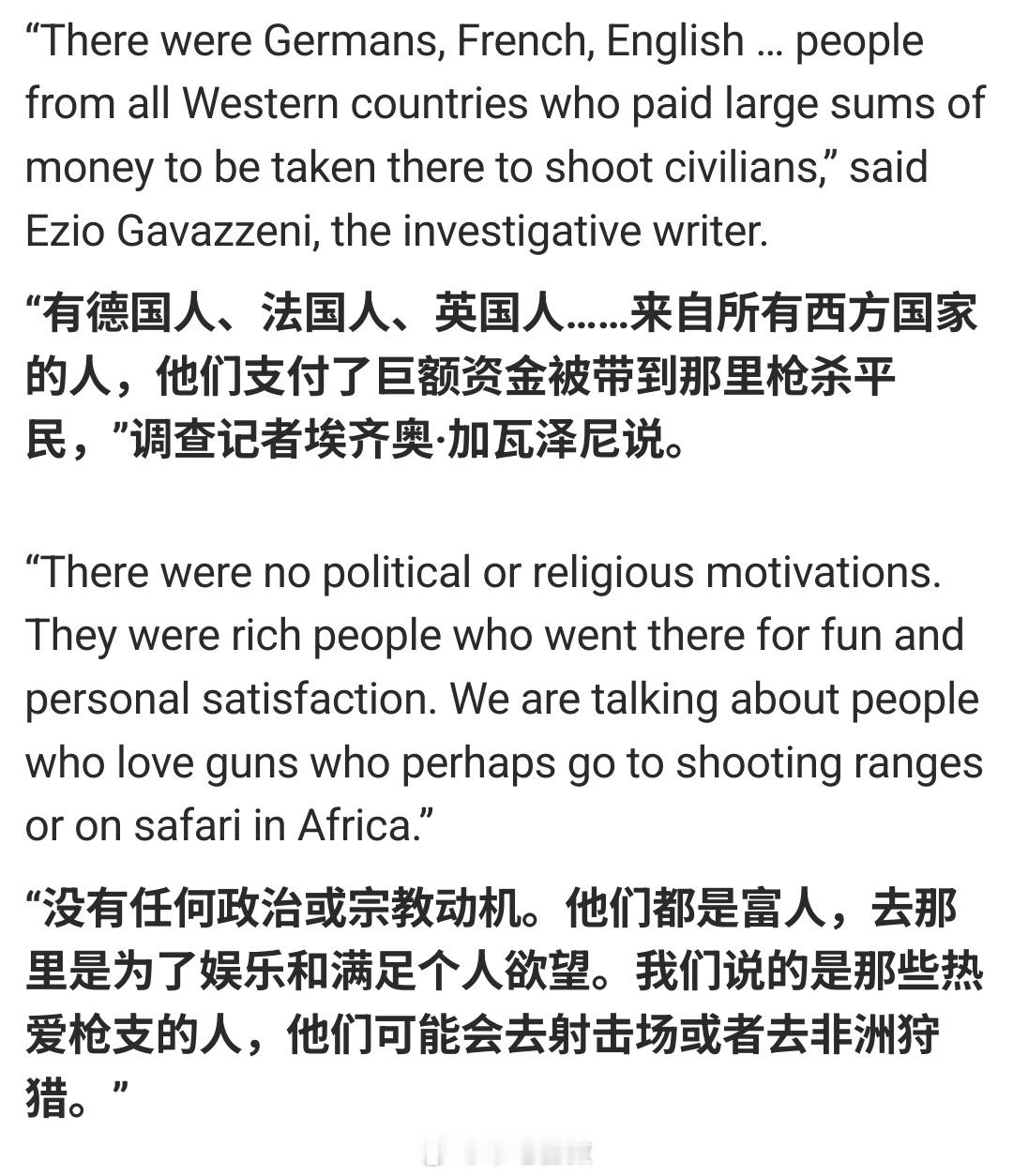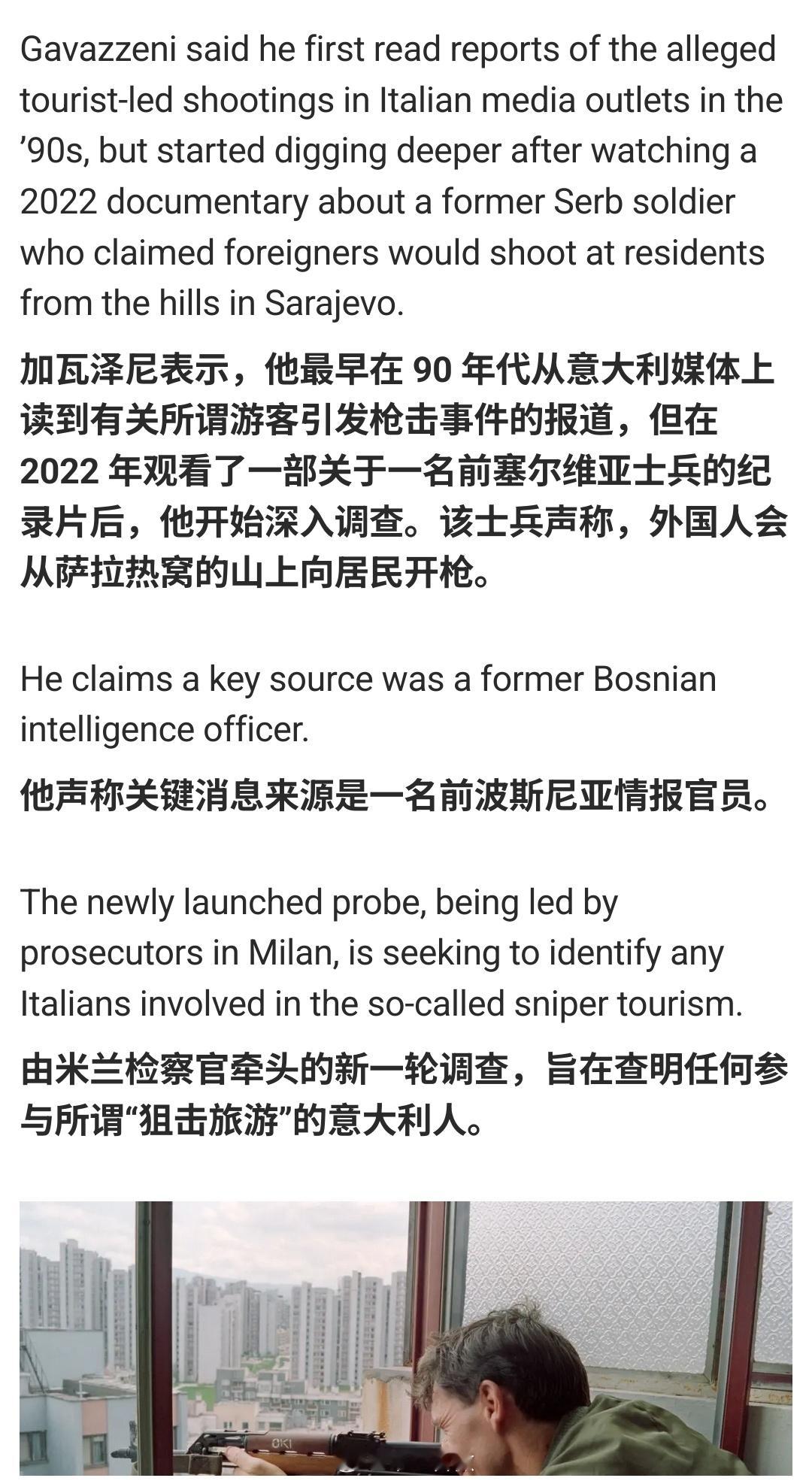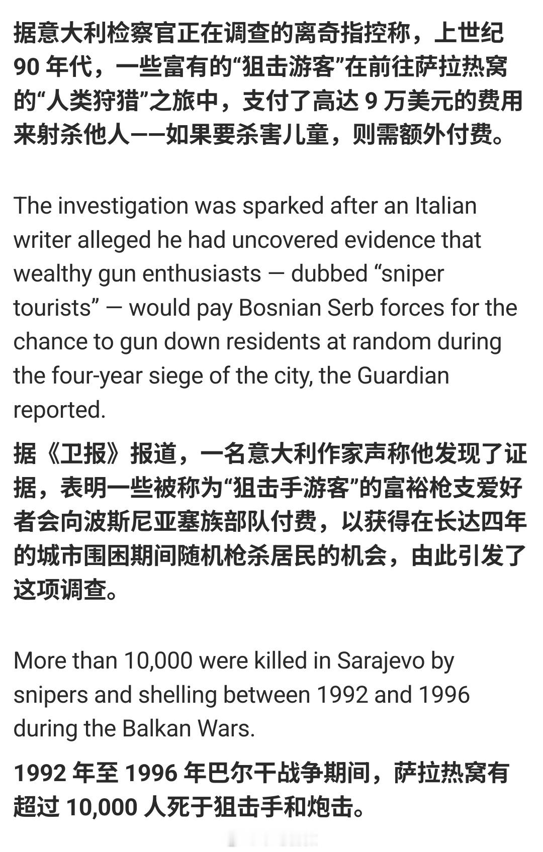 西方有点反人类了,曝光欧美富豪在90年代支付9万美元去萨拉热窝猎杀居民。根据意大利检察官的报告, 90年代,一群被称为“狙击手游客”的富豪 付款9万美元去 萨拉热窝进行“人类猎杀”, 如果杀小孩,要加钱。这个调查源自于意大利作家揭露了富有的持枪狂热者们“狙击手游客”, 会支付给波斯尼亚军队,然后获得在四年的萨拉热窝内战中 随意选择路过的居民进行猎杀。这些“狙击手游客”主要来自说英语 法语 德语的国家, 波黑塞族军队会把他们带到萨拉热窝周围的山坡上,以便让他们有良好的视野, 然后随机猎杀萨拉热窝的居民。在1992到1996年的巴尔干内战中,超过1万人被狙杀或炸死。