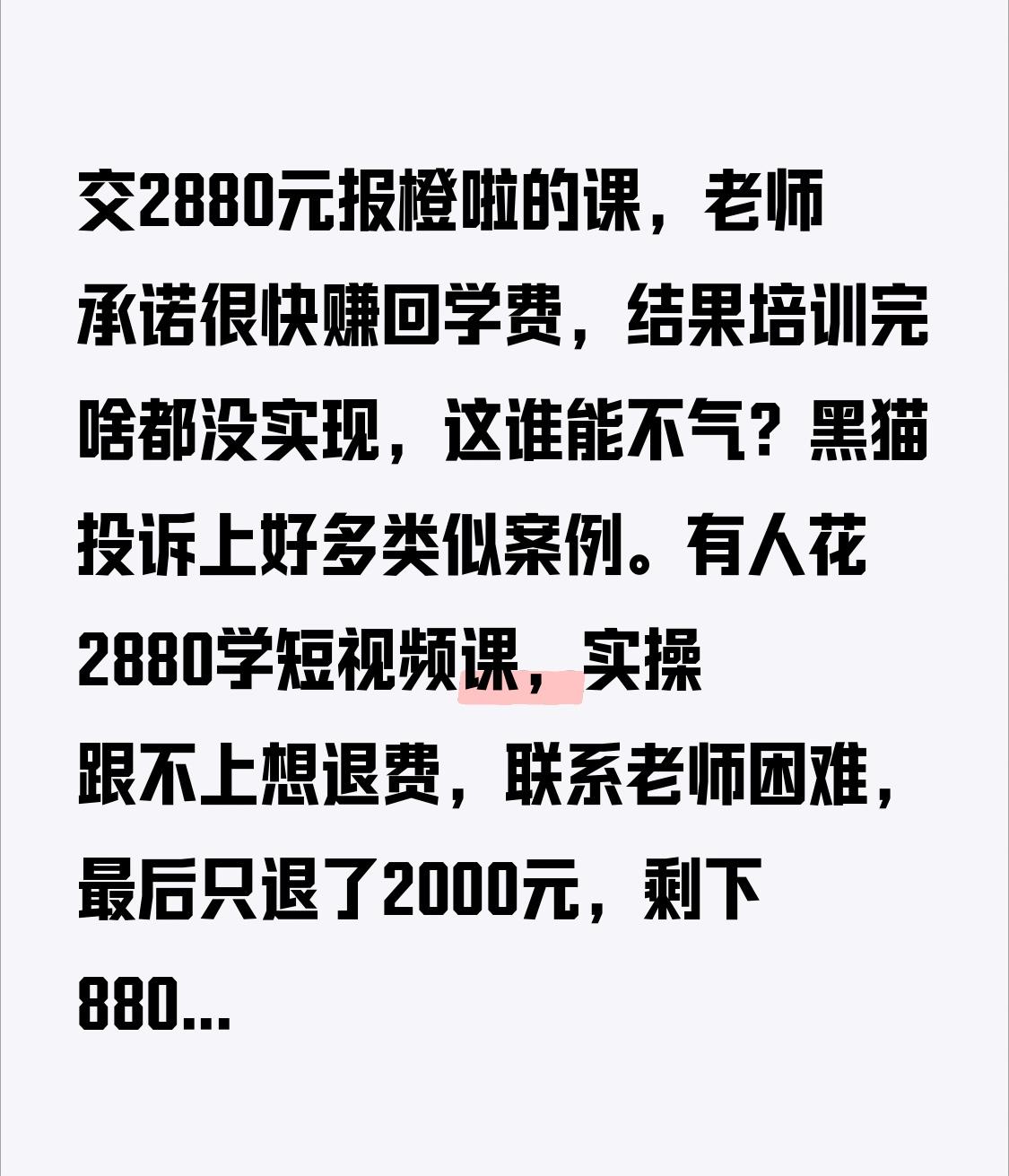 交2880元报橙啦的课,老师承诺很快赚回学费,结果培训完啥都没实现,这谁能不气?黑猫投诉上好多类似案例。有人花2880学短视频课,实操跟不上想退费,联系老师困难,最后只退了2000元,剩下880元的课也看不了,还没合同和发票。还有人被宣传能挣大钱吸引,交1300元学费,学几节课后又被要求交钱,发现上当后想退费,根本联系不上人。橙啦这虚假宣传、退费难的问题太严重,大家报名可得擦亮眼睛!