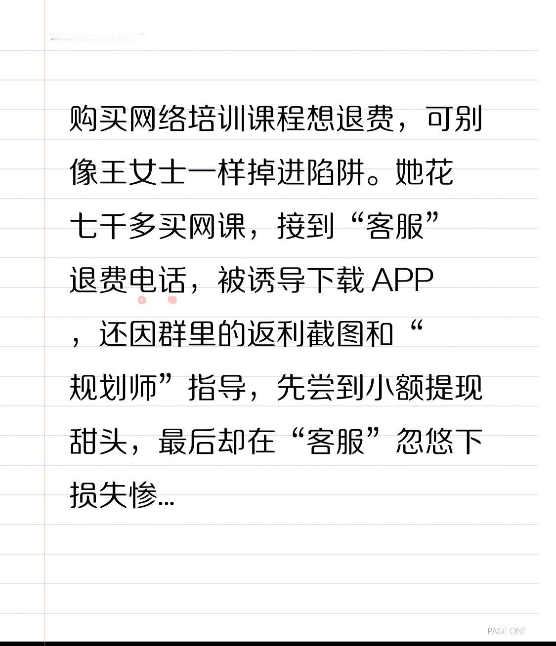 购买网络培训课程想退费,可别像王女士一样掉进陷阱。她花七千多买网课,接到“客服”退费电话,被诱导下载 APP,还因群里的返利截图和“规划师”指导,先尝到小额提现甜头,最后却在“客服”忽悠下损失惨重。 其实正规退费有办法。先和培训机构协商,表达退费意愿,了解退费政策。若有仲裁协议,可向仲裁机构申请;没有的话,直接向法院起诉,提交证据等判决。遇到退费“好事”要冷静,别被虚假返利骗了。