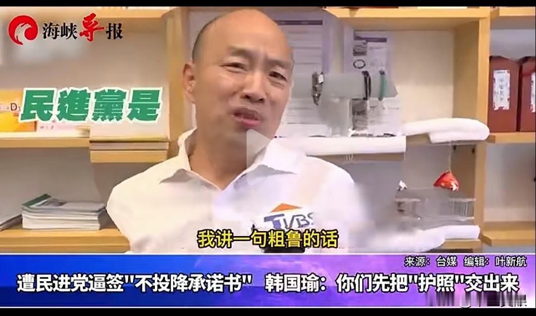 韩国爆粗口,反击民进党 民营党逼签“不投降承诺书”,韩国瑜爆粗口,“这就是脱裤子放屁”。 韩国瑜进一步说明: 什么人能够出卖台湾,有权利的人能够出卖台湾,现在叫我们在野党签不投降同意书,我们可以与台湾共存亡。你们先把民进党这些部长,立委,政府高官护照全都收缴起来,万一到了打仗,这些人全跑了怎么办? 韩国瑜一语道破“权中人”,点到民进党“抗中保台”死穴。民进党对韩院长的有力反击是骂也不是,笑也不是,哭也不是。