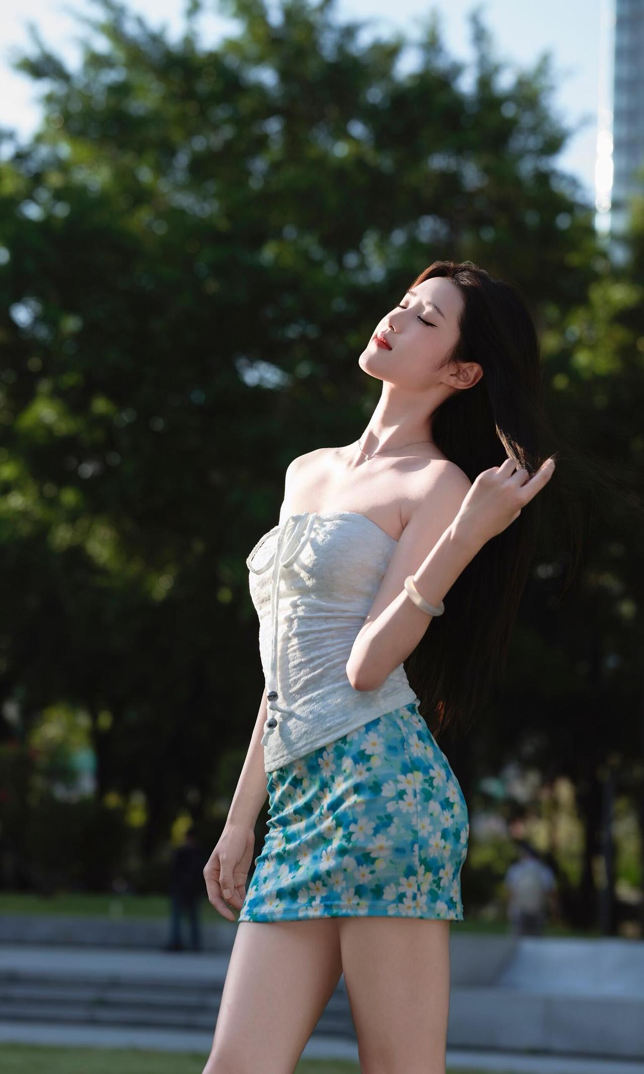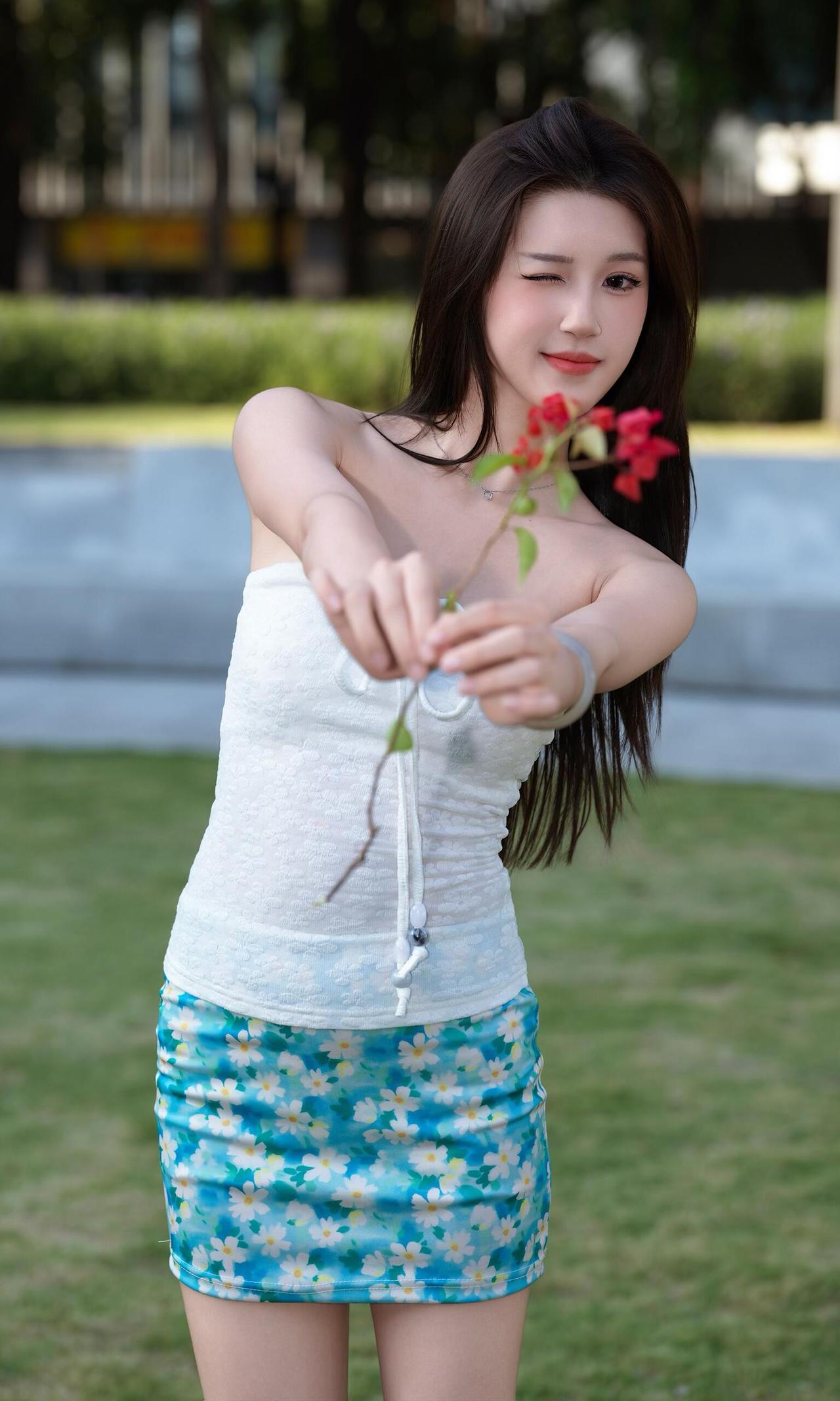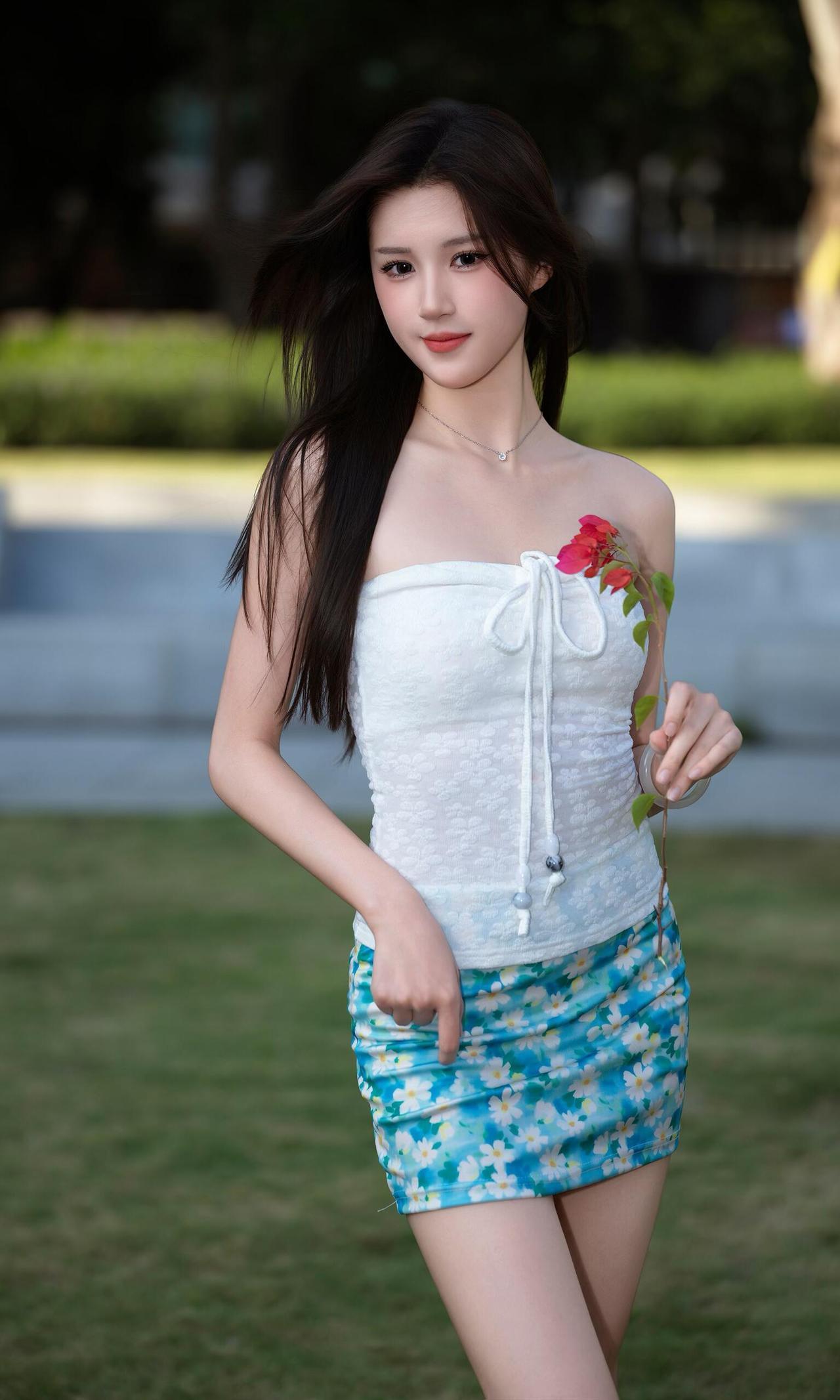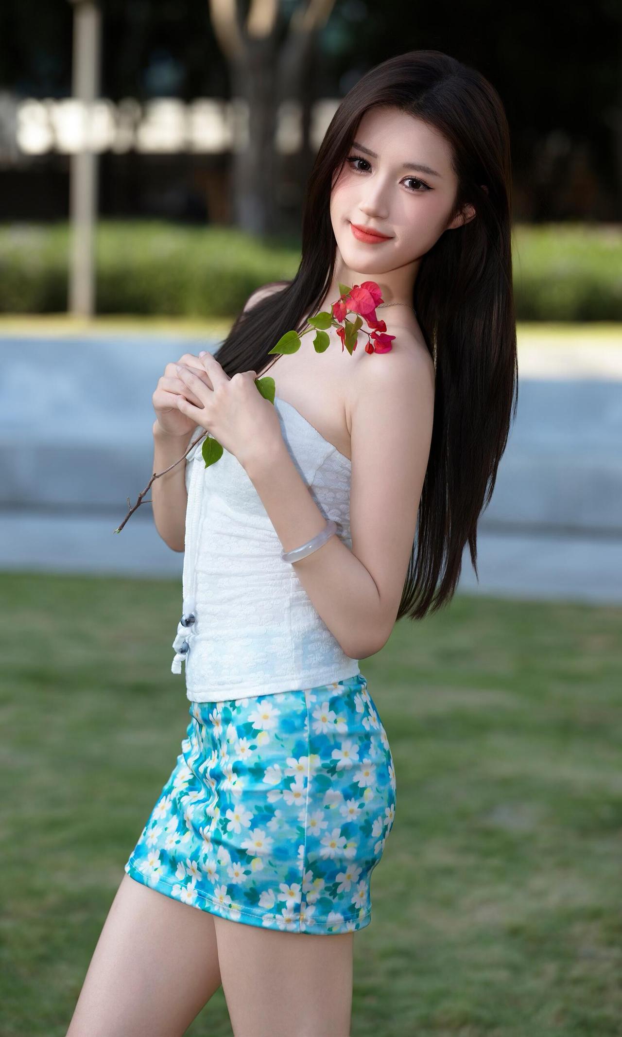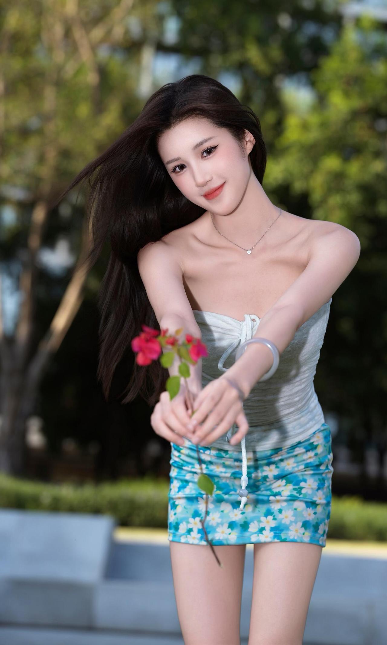 阳光下,裙摆轻扬如蓝白浪花,花与笑靥相映,是写给夏天的短诗。 她转身时,发梢缠着晚霞,那抹红是心事,也是未说出口的温柔。 石板路上,高跟鞋敲出轻快节拍,送你的花藏在身后,等一个回眸的瞬间。 暮色渐浓时,花影落在石阶,她轻轻靠着时光,说这朵小红花,只赠独一无二的你。 = = = = = = = = = = = = = = = = = = = = = = 这组「夏日花与少女」的拍摄思路📸 1️⃣ 光线:选下午4-5点的「黄金柔光」,侧逆光打在发丝/肩颈,自然勾勒通透轮廓(发丝光绝了) 2️⃣ 构图:多用「互动式引导线」(递花动作)+ 低角度仰拍,显身材又有呼吸感 3️⃣ 色彩:白裙+蓝花裙撞色,用三角梅的红做视觉锚点,画面清透又有记忆点 4️⃣ 动态:抓拍甩发/抬手,肢体舒展不僵硬,氛围感直接拉满