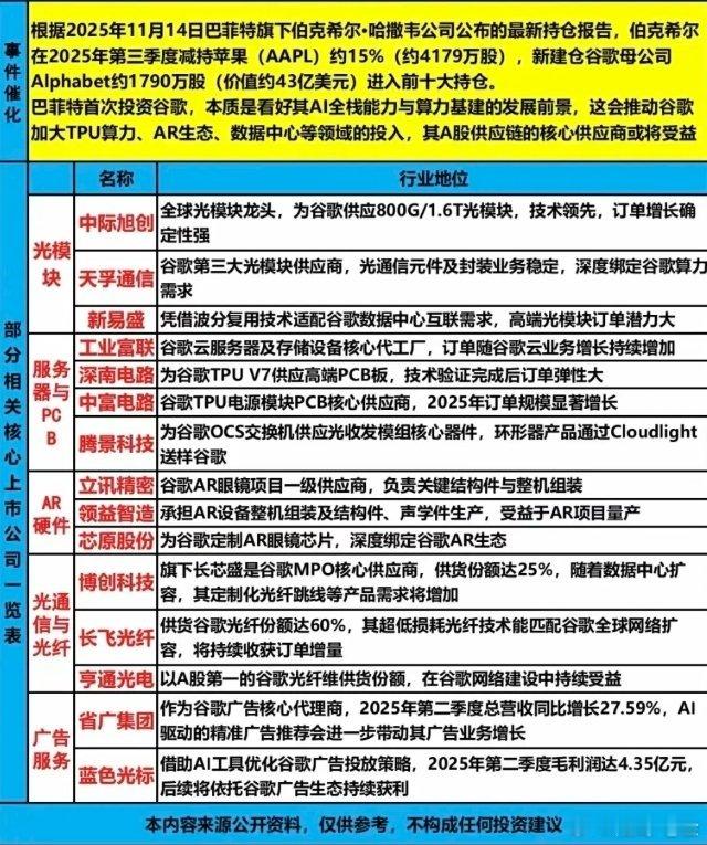 谷歌概念受益个股梳理分析!“谷歌概念”核心源于2025年三季度巴菲特icon旗下伯克希尔减持苹果、新建谷歌母公司Alphabet仓位,逻辑是看好谷歌AI能力与算力基建前景,由此梳理了谷歌供应链相关A股公司,覆盖光模块、服务器/PCB、AR硬件、光通信、广告服务等板块,这些企业多为谷歌对应业务的核心供应商,有望受益于谷歌在TPU算力、AR生态、数据中心等领域的投入扩张。个股梳理分析1. 中际旭创:全球光模块龙头,为谷歌供应800G/1.6T光模块,技术领先且订单增长确定性强,是谷歌光模块供应链核心参与者,后续将直接受益于谷歌算力基建、数据中心的扩张需求。2. 天孚通信:谷歌第三大光模块供应商,光通信元件及封装业务稳定,与谷歌算力需求深度绑定,随着谷歌加大算力基建投入,其配套光通信元件的订单有望稳步增长。3. 新易盛:凭借波分复用技术适配谷歌数据中心互联需求,主打高端光模块,当前该类产品在谷歌供应链的订单潜力较大,后续谷歌数据中心扩容将释放其高端光模块供货需求。4. 工业富联:谷歌云服务器及存储设备核心代工厂,订单随谷歌云业务增长持续增加,作为谷歌云硬件核心代工方,后续谷歌云扩张将直接带动其代工业务订单提升。5. 深南电路:为谷歌TPU V7供应高端PCB板,技术验证已完成,后续订单弹性大;TPU是谷歌AI算力核心硬件,谷歌加大TPU投入将快速释放其PCB板需求。6. 中富电路:谷歌TPU电源模块PCB核心供应商,2025年订单规模显著增长,绑定谷歌TPU硬件供应,后续谷歌TPU算力基建推进将持续提升其订单需求。7. 腾景科技:为谷歌OCS交换机供应光收发模组核心器件,环形器产品已送样谷歌;OCS是谷歌算力基建关键设备,若送样通过,有望获得更多器件订单。8. 立讯精密:谷歌AR眼镜项目一级供应商,负责关键结构件与整机组装,AR是谷歌重点布局生态,后续AR项目量产将直接带动其结构件、组装业务订单增长。9. 领益智造:承担谷歌AR设备整机组装及结构件、声学件生产,是谷歌AR硬件供应链重要参与者,AR项目从研发转量产将明显提升其相关业务营收贡献。10. 芯原股份:为谷歌定制AR眼镜芯片,深度绑定谷歌AR生态,AR芯片是AR眼镜核心部件,其定制业务深度参与AR硬件底层,后续AR生态扩张将持续带动芯片需求。11. 博创科技:旗下长芯盛是谷歌MPO核心供应商,供货份额25%;MPO是数据中心光互联关键器件,谷歌数据中心扩容将增加其定制化光纤跳线等产品需求。12. 长飞光纤:供货谷歌光纤份额达60%,超低损耗光纤技术匹配谷歌全球网络扩容,作为谷歌光纤主力供应商,后续谷歌网络、数据中心扩张将带来持续订单增量。13. 亨通光电:谷歌光纤供应链中A股供货份额第一的企业,后续谷歌全球网络建设、数据中心互联等基建推进,将持续支撑其光纤产品订单。14. 省广集团:谷歌广告核心代理商,2025Q2总营收同比增27.59%,AI驱动的精准广告推荐将强化其业务增长动力,持续受益于谷歌广告扩张与AI赋能。15. 蓝色光标:借AI工具优化谷歌广告投放策略,2025Q2毛利润达4.35亿元,依托谷歌广告生态持续获利,AI提升投放效率的模式将支撑业务盈利增长。总结本次梳理围绕巴菲特布局谷歌的动作,聚焦谷歌AI、算力、AR等业务的A股供应链企业,覆盖多环节核心供应商,理论上会随谷歌相关领域投入扩张受益。本文涉及资讯、数据等内容来自网络公共信息,仅供参考,不构成投资建议!