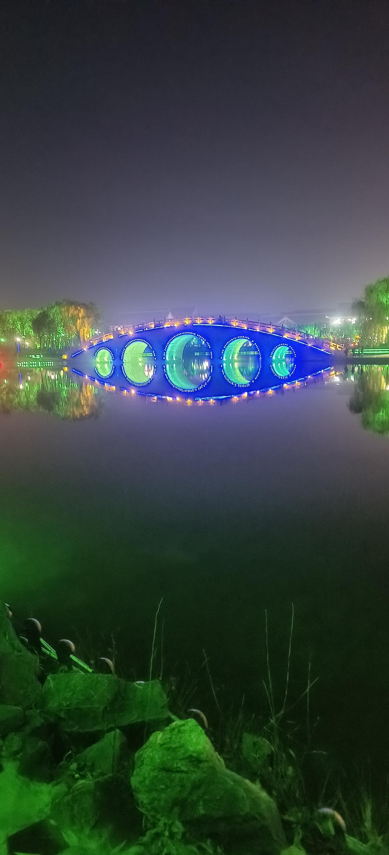 夜桥映月 蓝桥卧水倒流光 圆镜卧塘映碧泱 柳摆波心叠彩影 风听雾软梦甜香 这是天水甘谷县姜伯约公园