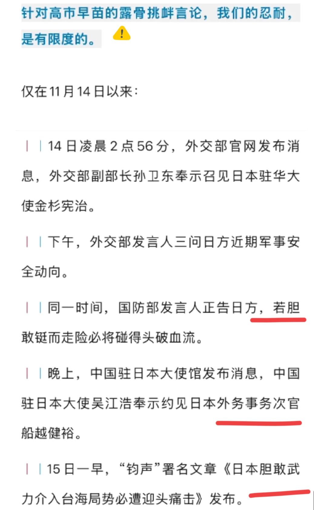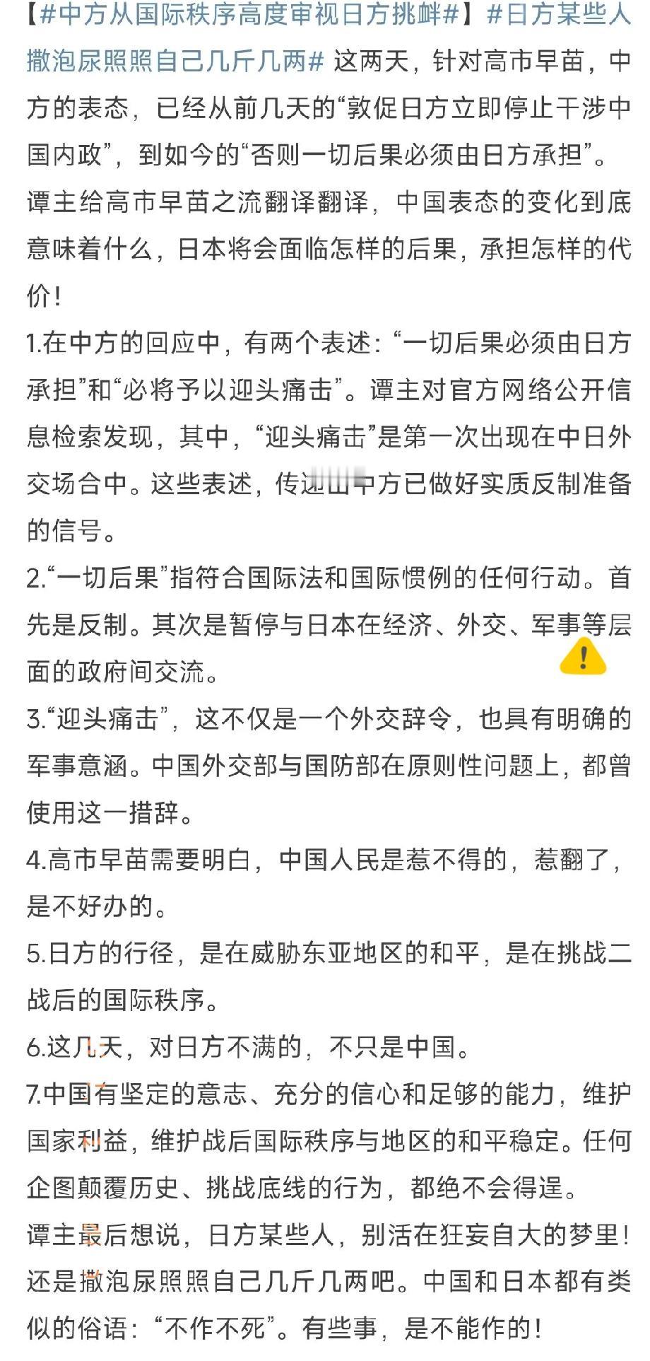 针对高市早苗,央媒又开骂了,这次骂得更狠 这两天,央媒旗下账号“玉渊潭天”可真是火力全开了,前两天刚发了篇长文,说高市早苗“满嘴喷X”、“脑袋被驴踢了”,引发了全球网友的热议。15日,“玉渊潭天”又发了篇文,这次骂得更狠了,直接让某些日本人“撒泡尿照照自己几斤几两”。 能让央媒放下“大国雅言”这般硬核开怼,绝不是一时兴起,而是底线被反复触碰后的忍无可忍。 高市早苗的狂妄言论,本质是拎不清自己的位置,忘了历史教训也低估了中国的决心。 要知道,央媒的每一次发声都藏着态度,旅游提醒只是开始,后续反制措施绝不会手软。 别真以为中国的克制是软弱,一旦踩破红线,新仇旧恨一起算,日本可承受不起这后果。 你觉得日本会及时收敛,还是继续在危险边缘试探?来评论区说说你的判断~
