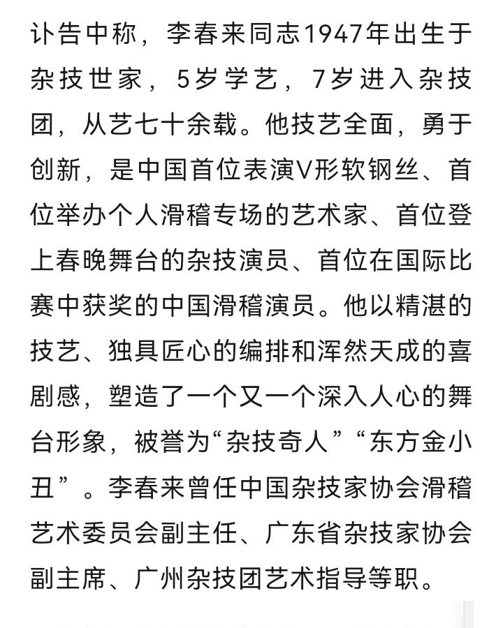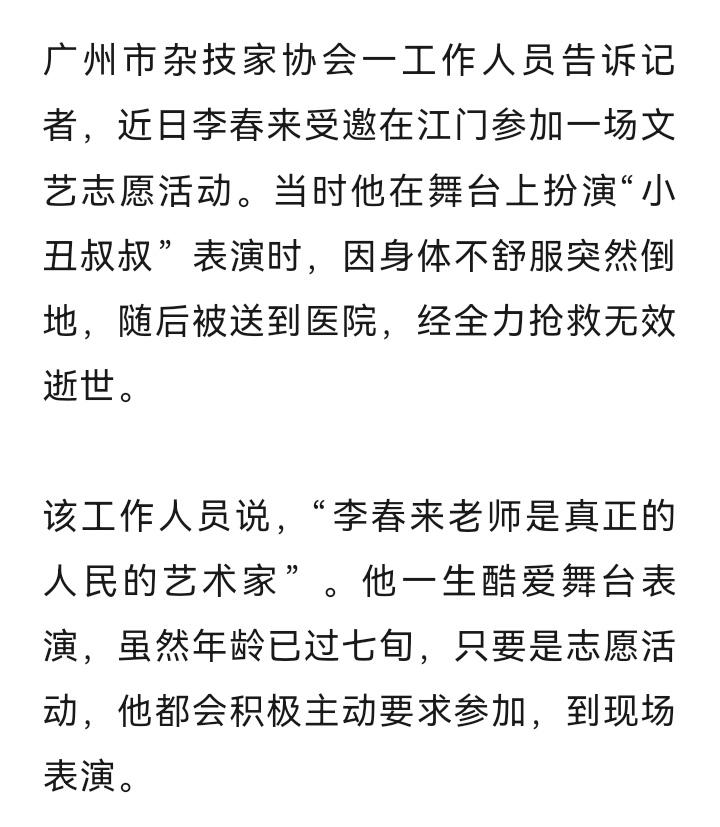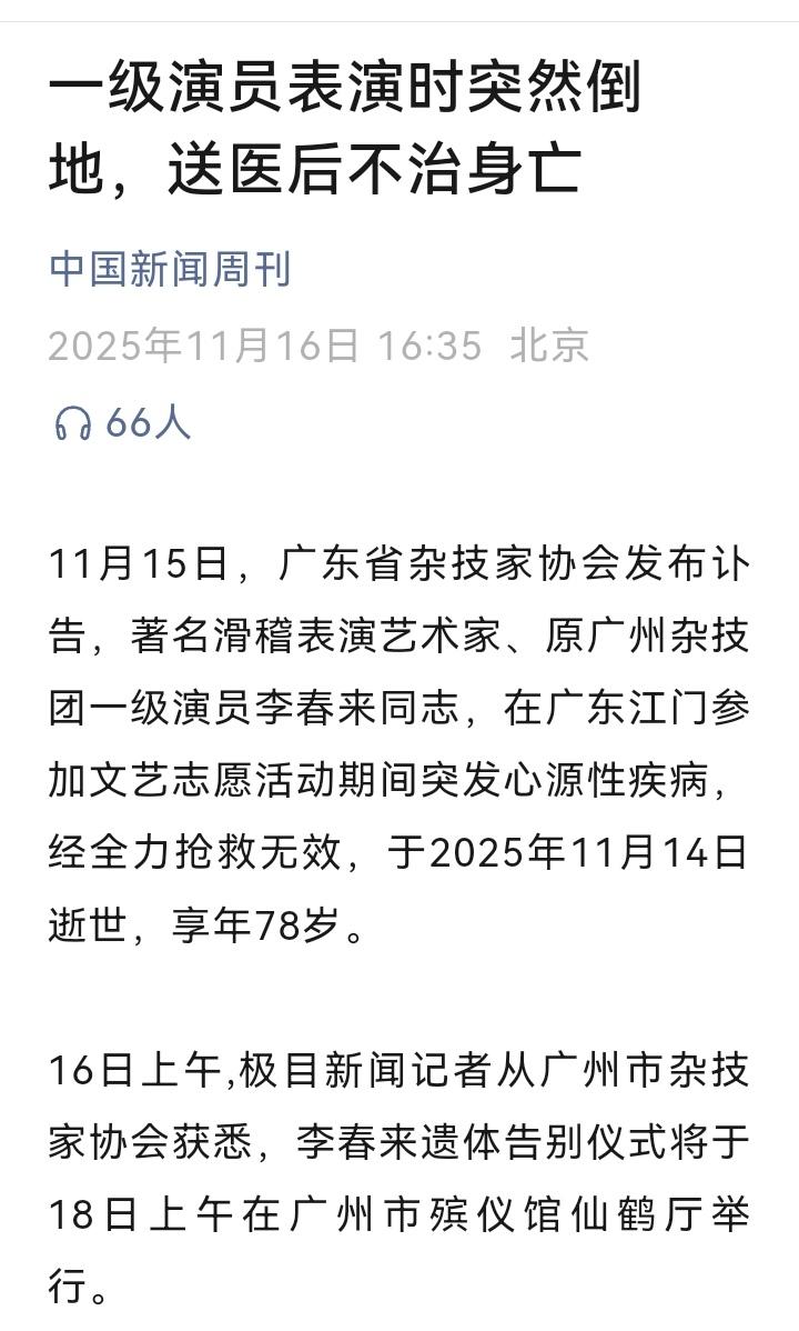 不服老不行!就在昨天,78岁老演员在演出期间猝然离世(详见附图)! 看着新闻,想起李老师舞台上永远生龙活虎的样子。他总给我们一种错觉——艺术家永远不会老。可生命就是这么真实,它不会配合我们的演出。 我们这代人啊,年轻时比谁都能熬,中年时比谁都能扛。五十多岁爬楼梯不喘气,六十多岁还觉得自己是小伙子。可一到七十,身体就像用了大半辈子的老零件,说罢工就罢工。 这世上最残酷的醒悟,就是突然发现自己不再年轻。 身边多少老伙计,退休后反而更拼——带孙子比上班累,跳广场舞要比谁动作难,旅游非要挑战高原雪山。不是不服输,是打心底拒绝承认:我们老了。 可生命需要敬畏。该慢时要慢下来,该软时要软下来。 真正的智慧,是懂得在什么年纪做什么事。 七十岁后,要学会做人生的“旁观者”——看着年轻人去拼,在旁边鼓鼓掌;看着新事物出现,试着去理解而不是批判。把身体当老朋友好好呵护,它陪你风风雨雨几十年,值得最温柔的对待。 李老师用生命给我们上了最后一课:老不是失败,不服老才是。 从今天起,对自己好一点。累了就休息,不舒服马上就医。这不是认输,是真正活得明白。 优雅地老去,比勉强地年轻更体面。 李春来老师,谢谢您带给我们的所有欢笑。愿您在另一个舞台,永远轻盈,永远快乐。 如果您觉得这篇内容对身边的亲友有启发,欢迎转发给他们。提醒我们爱的人:珍惜当下,优雅前行。老年人离世 演员病逝