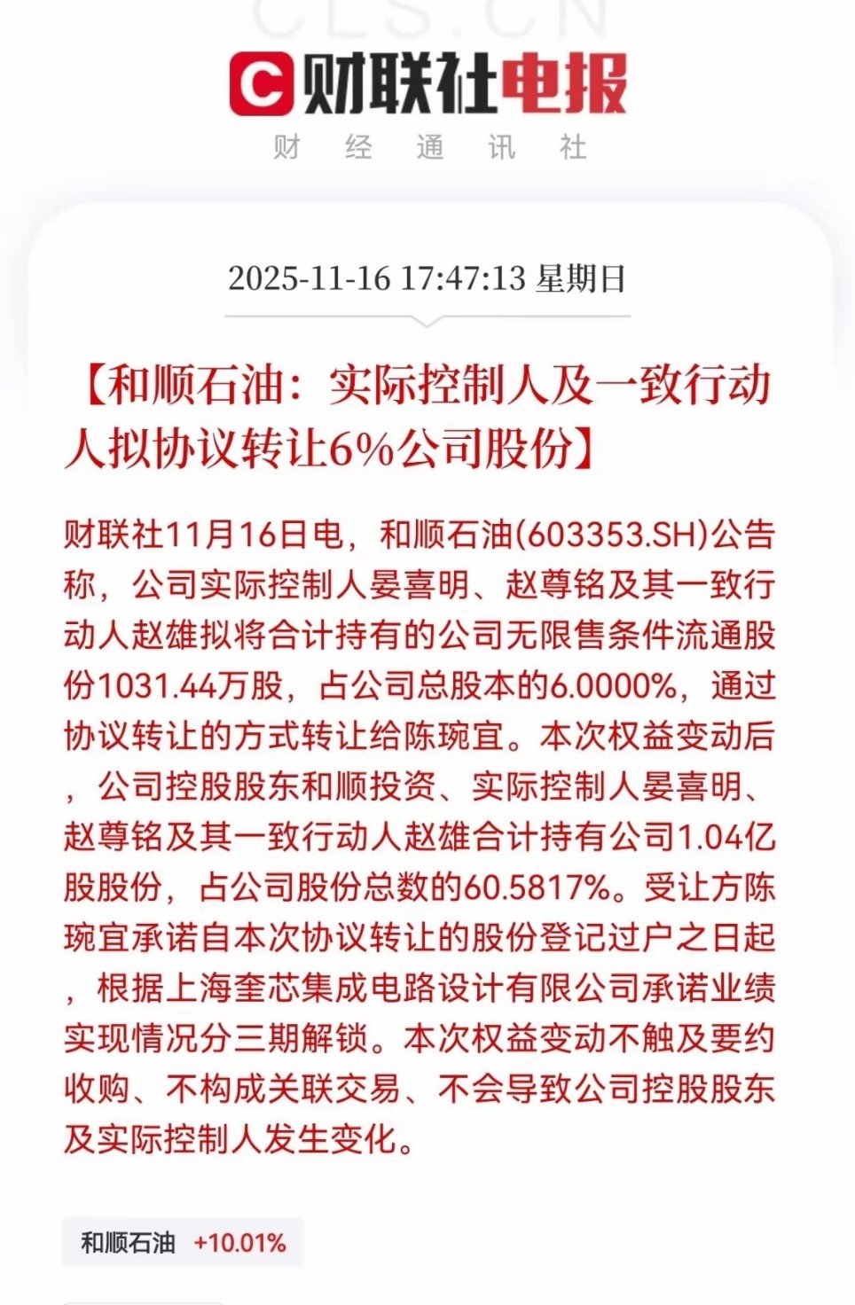 石油跨界半导体,和顺石油下周会起飞吗?今天和顺石油发布公告,公司拟现金方式收购奎芯科技34%股权,并取得控制权。奎芯科持是一家从事半导体芯片设计的科技企业,和顺石油这次收购意味着该公司将进入半导体行业,这是一个重大利好消息。令人担忧的是该股本月已经有了一波涨幅,上周五更是强势涨停,说明主力已经提前介入了。明天和顺石油继续连板应该问题不大,悬念是主力到底拉升几个板出货?或许盈新发展可以参照一下。