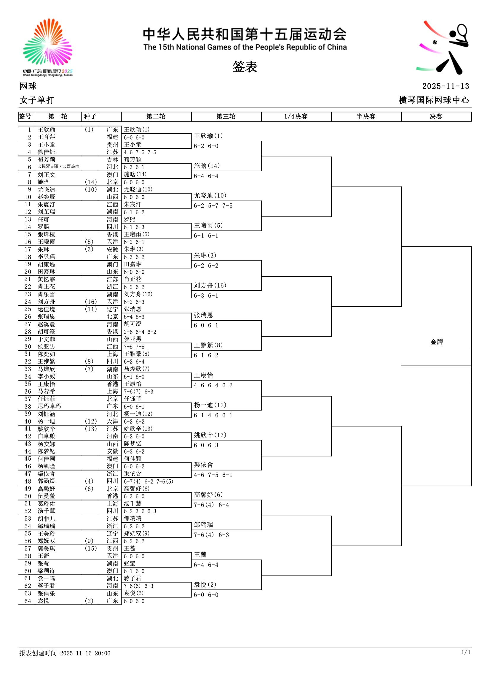 网球男女单16强出炉,终于来到一些熟悉名字之间的对战👁男单两位种子掉队,女单五位种子掉队⬇️【1】王欣瑜(广东)🆚 施晗(北京)【14】【10】尤晓迪(湖北)🆚 王曦雨(天津)【5】【3】朱琳(安徽)🆚 刘方舟(天津)【16】张瑞恩(北京)🆚 王雅繁(四川)【8】王康怡(香港)🆚 杨一迪(天津)【12】【13】姚欣辛(江苏)🆚 渠依含(浙江)【6】高馨妤(北京)🆚 邹瑞瑞(浙江)王蔷(天津)🆚 袁悦(广东)【2】【1】布云朝克特(浙江)🆚 王傲然(天津)【15】刘汉屹(上海)🆚 商竣程(北京)【5】【4】周意(广西)🆚 王晓飞(浙江)【14】尼敦坚赞(河北)🆚 张之臻(上海)【8】【6】孙发京(河北)🆚 特日格乐(北京)【10】【13】肖霖昂(上海)🆚 吴易昺(浙江)【3】【7】崔杰(北京)🆚 张天汇(河南)【12】【16】曾姚杰(广东) 🆚 黄泽林(香港) 【2】