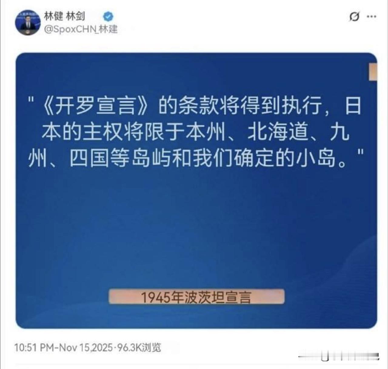 听到这个消息,我实在按捺不住内心的激动!中国终于正式对日本领土范围提出了明确质疑。 就在今日,外交部发言人公开援引《波茨坦公告》中的核心条款——该公告明确界定日本合法领土仅包含本州、九州、北海道及四国四大岛屿,其余岛屿均不在其领土范畴之内。 这是我国首次针对日本领土问题亮出明确态度,既是对日本无视战后国际规则、公然违背一个中国原则的强力反制,更暗藏警示之意:若日本仍执迷不悟、持续纠缠挑衅,中国必将坚决维护《波茨坦公告》的权威,坚定捍卫二战以来形成的国际秩序成果。 消息一出,网友们纷纷热议,不少人表示:这无疑是战略层面的主动出击,为后续琉球问题正式纳入国际议程埋下伏笔!咱们向来秉持“不惹事但绝不怕事”的原则,《波茨坦公告》所确立的规则,早就该真正落地执行了! 这番表态迅速在国际舆论场掀起巨大波澜,引发广泛关注与讨论。不知道日本方面在看到这一明确立场后,会生出怎样的感慨与反应?