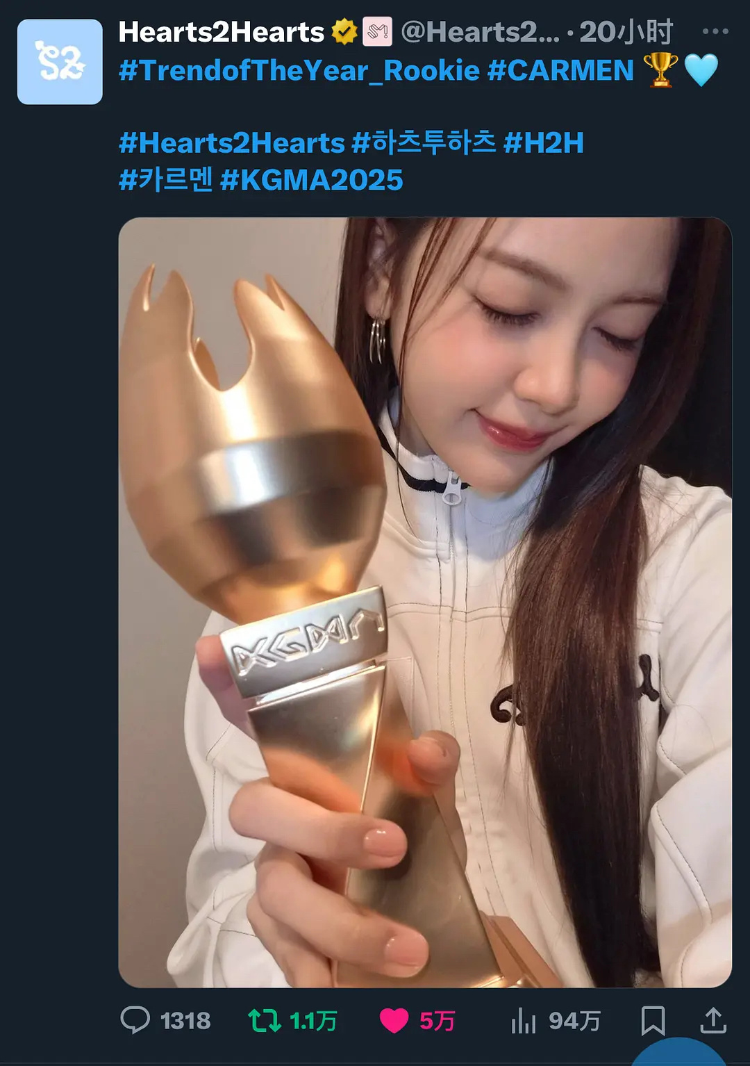 hearts2hearts官推最高赞出现Carmen 20个小时5w赞👍🏻队内第一获得单人奖的 出道还未满一年