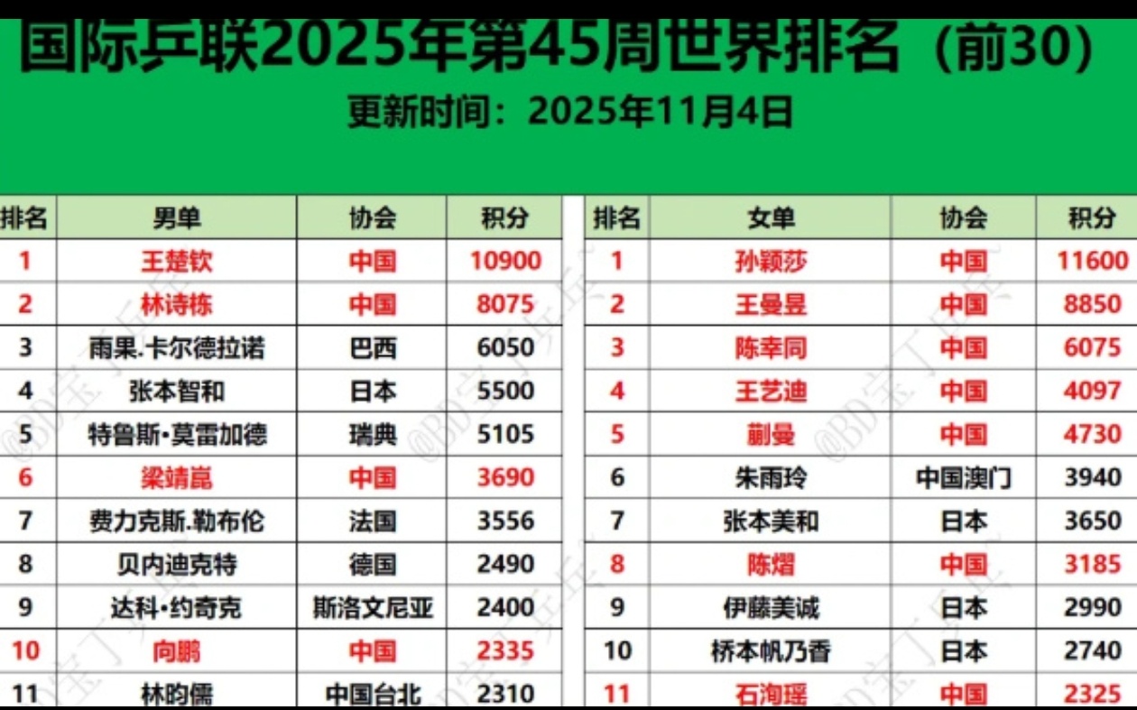 孙颖莎和王楚钦都是国际乒联排名世界第一,却都无缘本次全运会金牌。全运会冠军果然比
