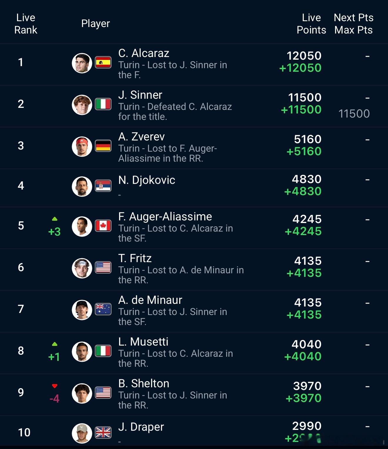 随着辛纳夺冠、阿尔卡拉斯拿亚,2025赛季ATP年终世界排名尘埃落定。 阿尔卡拉斯凭借闯入决赛的表现以12050分加冕年终世界第1;辛纳卫冕排名第2,兹韦列夫、德约科维奇、分列3—4位;本赛季大回春打进总决赛的阿利亚西姆凭借首进4强的表现,世界排名来到第5;弗里茨、德米纳尔、穆塞蒂分列6—8位;谢尔顿、德雷珀守住top10门槛,11为布勃里克。