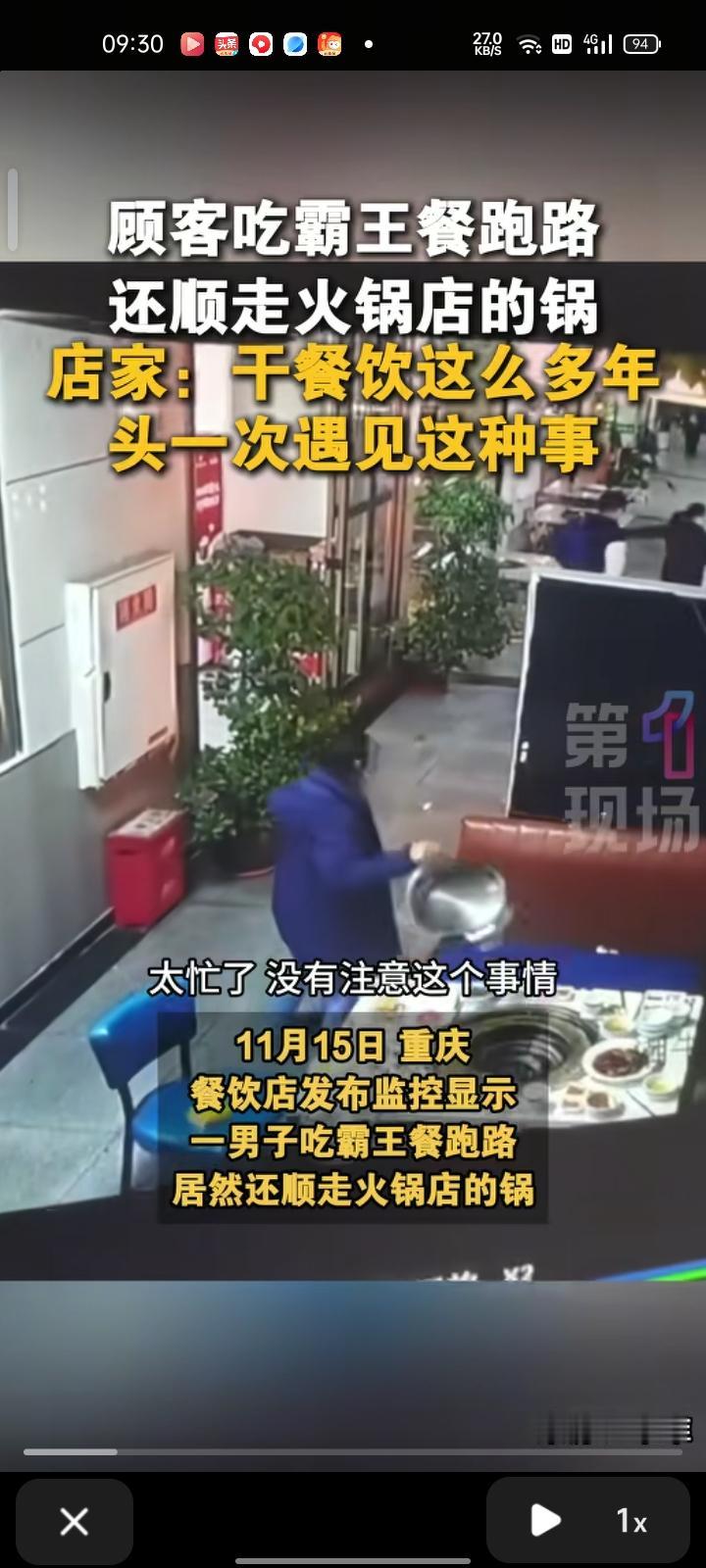 11月15日,重庆。餐饮店发布监控视频显示,男子吃饭不给钱玩跑单,居然顺走火锅店的锅,让老板大开眼界。店老板表示,干餐饮这么多年,头一次遇到这种事,已报案处理。