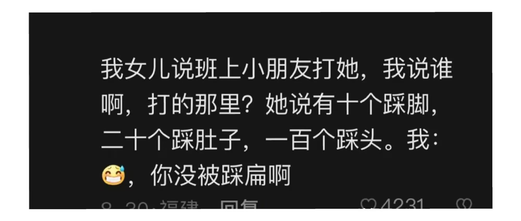 她说有十个踩脚二十个踩肚子,一百个踩头 我:你没被踩扁啊