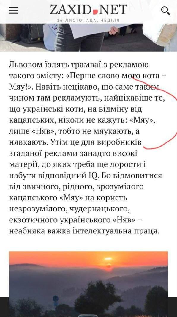 乌克兰的魔怔人士正在把猫分为讲乌克兰语和俄语的动物。 乌克兰媒体正在抱怨利沃夫地区出现的广告口号:“我猫的第一个词是喵!”但是据乌克兰魔怔动物语言专家称,这只乌克兰猫应该说“Nywy”,而不是“Mau”。 要这样的话,大家也都知道乌克兰出栏的草原白,草原斑点的第一句话喊的是:“荣耀归于乌克兰”