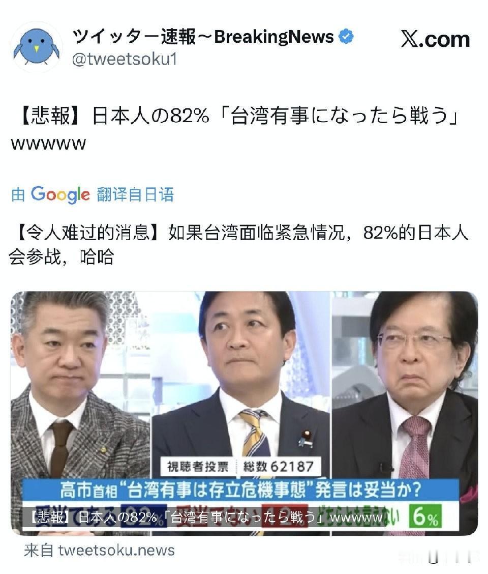 这很能说明问题,只到今天小鬼子们都还觊觎中国的土地,与80年前木有两样。 也看了一些采访,虽然82%多数指的是医疗、补给,如果问是否愿意上前线,估计比9%更低。毕竟上前线和调查内容是两回事,一个自己要上战场,一个不用上战场,摇旗呐喊让别人去死[抠鼻]台湾有事论