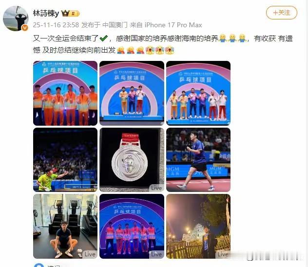 林诗栋发文总结全运会啦!海南少年的“破纪录”之旅:林诗栋的银牌,为何让海南沸腾? 林诗栋在社交媒体上晒出那枚沉甸甸的全运会银牌,配文“有收获有遗憾,继续向前出发”时,相信整个海南全省都为这个20岁的少年沸腾了。 11月16日,他虽以1:4不敌奥运冠军樊振东无缘金牌,但这枚银牌却承载着海南乒乓球数十年的期盼——它是海南建省办经济特区以来,首枚全运会乒乓球奖牌,是一次从零到一的历史性突破。 从海南小小俱乐部的小球台到全运会决赛场,林诗栋的成长轨迹里,藏着一个少年的执着与一座省份的守望。2005年出生的他,10岁时正式入选海南省乒乓球队,启蒙教练关艳至今记得这个“对乒乓球感觉极好”的孩子:在场边默默模仿动作,一板一眼都透着股认真劲儿。2018年,13岁的林诗栋拿下全国U13组男单冠军,初露锋芒;2020年,15岁的他斩获全国青年锦标赛男单冠军,成为海南历史上首位入选国家乒乓球队的运动员,从此踏上更大的赛场。 国际赛场上,他是被誉为“小樊振东”的潜力新星,以爆烈的球风、强劲的杀板和稳健的相持能力闻名,不仅击败过多位世界排名前十的选手,世界排名也曾攀升至第一,截至2025年10月已斩获51枚国内外重大赛事金牌。 但全运会的赛道,对他而言曾是一道难跨的坎。2021年十四运,初次参赛的林诗栋在首轮便止步32强,那场2:4不敌刘丁硕的比赛里,却也深知自己与顶尖选手的差距。 四年磨一剑,这份差距在第十五届全运会上被悄悄抹平。作为男单2号种子,林诗栋一路过关斩将,先后击败孙闻、黄友政等实力选手,半决赛中更是力克辽宁名将袁励岑,昂首挺进决赛。 全运会乒乓球赛事被誉为“地表最难赛事”,汇聚了全国所有顶尖高手,每一场胜利都堪称硬仗。而他的晋级之路,多次面临局分落后的逆境,却总能凭借“敢打敢拼”的劲头逆风翻盘,这份拼搏精神,正是海南运动员最动人的底色。 这枚银牌,对林诗栋而言是成长的勋章,对海南而言则是跨越时代的里程碑。在此之前,海南乒乓球在全运赛场上从未站上领奖台,林诗栋的突破,不仅实现了“零的突破”,更点燃了整个省份的体育热情。更重要的是,他的成功为海南乒乓球注入了前所未有的发展动力——海南省旅文厅已明确表示,将进一步加大对乒乓球项目的扶持力度,完善后备人才梯队建设,让更多海南少年有机会走上职业赛场。 他为海南带来的,远不止一枚奖牌。作为海南本土自主培养的国际级运动健将,林诗栋的成长轨迹成为海南乒乓球发展的缩影,他的存在,更成为无数海南孩子的榜样——原来从家乡的小球台,也能走向全国乃至世界的大舞台。这种精神层面的激励,比奖牌更具穿透力,正激励着更多海南青少年投身体育运动,为家乡争光。 决赛不敌樊振东,林诗栋坦言有遗憾,但这份遗憾恰是成长的动力。正如他所说,会“及时总结继续向前出发”。 这不是终点,而是新的起点。当林诗栋带着银牌继续奔赴下一个赛场,海南乒乓球也正沿着他开辟的道路坚定前行。这个从儋州走出的少年,为家乡写下了最动人的体育篇章。未来可期,我们有理由相信,下一次,他会带着更大的梦想,为海南赢得更多荣光。