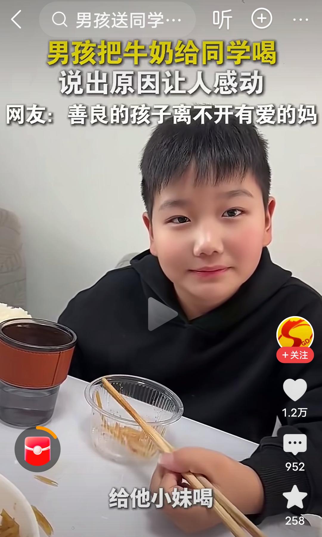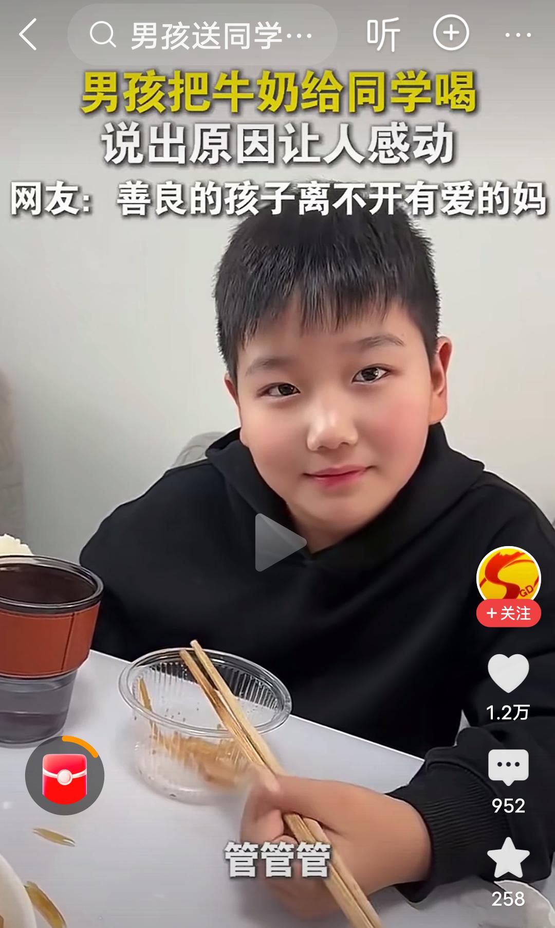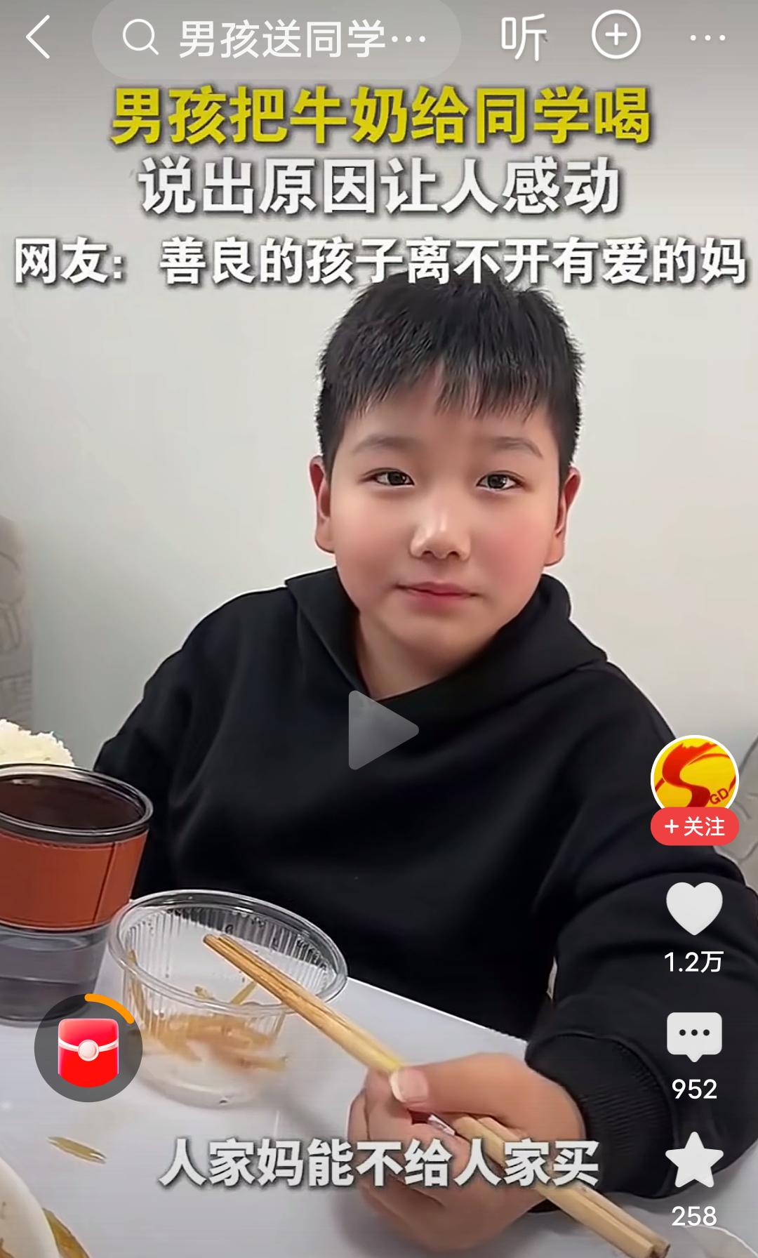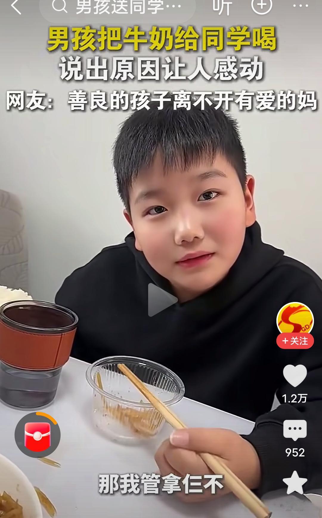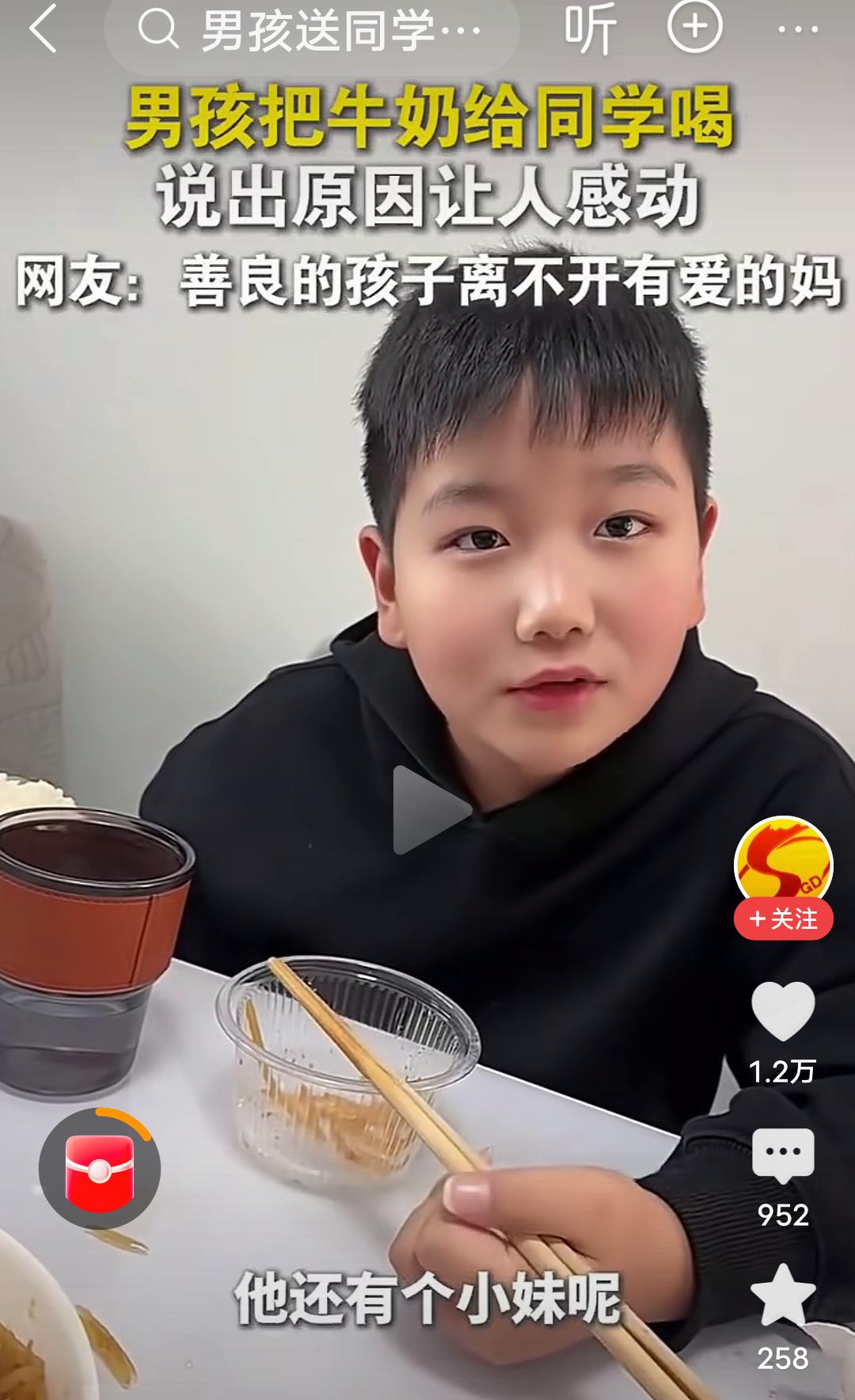 原生家庭的教育和成长环境真的很重要! 在河南,视频里的这个男孩,每天都把自己带的牛奶给同学喝,后来被妈妈发现了,当时不理解,说你别给你同学了,被人家妈妈知道了,多不好,结果这个男孩的一句话,“他没有妈妈”,瞬间让人泪目,妈妈也哽咽了,说那以后你拿两个吧,你俩一人一个。 男孩接着说,我管拿三个吗?妈妈有点纳闷,问为什么拿三个?男孩说,他还有个妹妹,每次他都舍不得喝,给他妹妹喝,妈妈连说管,管,管…… 河南人特有的管,管,管,管出了母爱的伟大,管出了母爱的无私,管出了母爱的奉献, 妈妈是孩子的第一任老师,母慈子孝,正是因为妈妈的善良,正是因为原生家庭良好的教育,才培养出如此善良有爱的男孩。 这个男孩满脸的善良厚道,足见一家满门的忠孝厚爱,言语之间全是爱与温暖。 良好的家教,懂事的孩子,真应了那句话:忠厚传家远,诗书继世长。