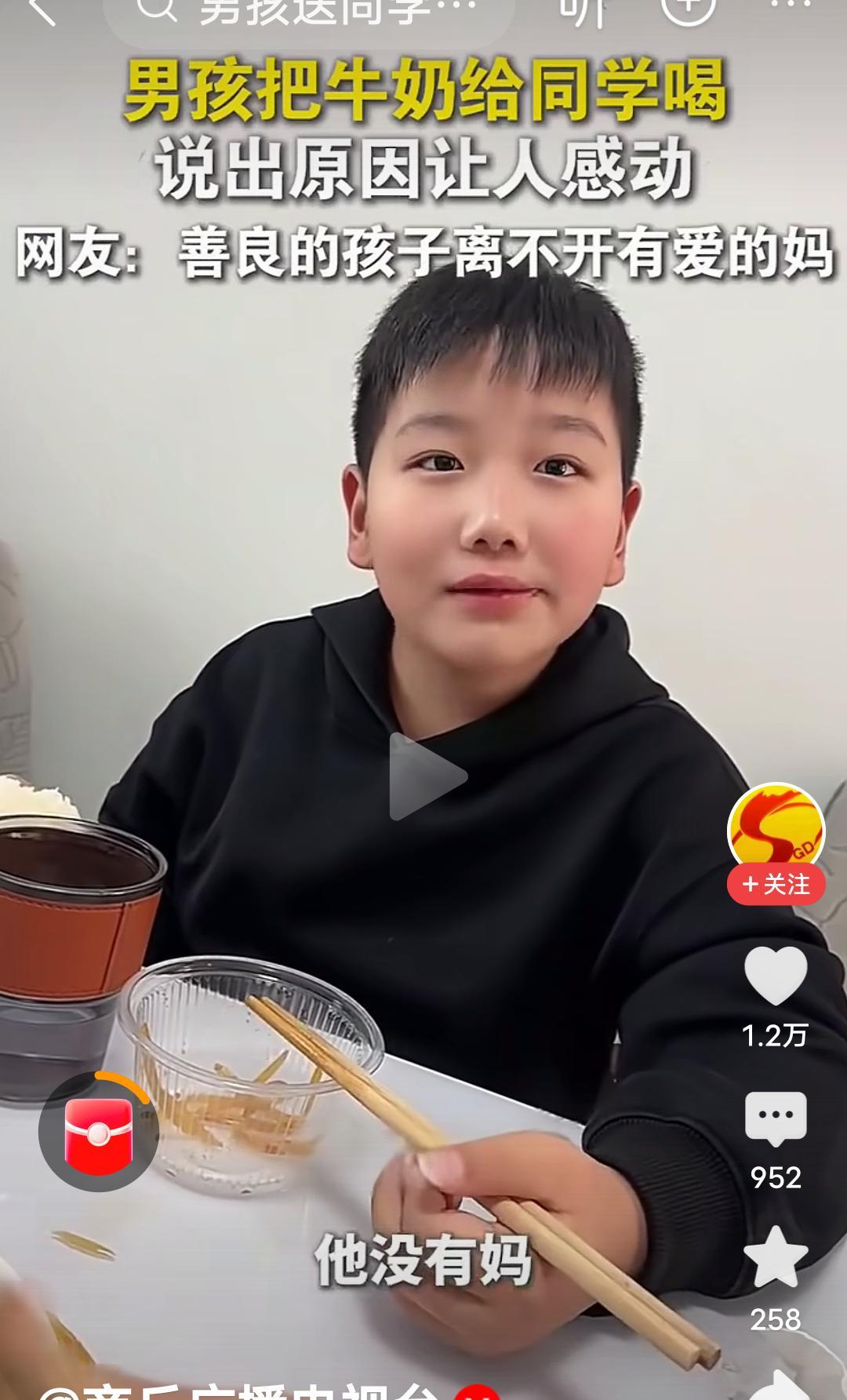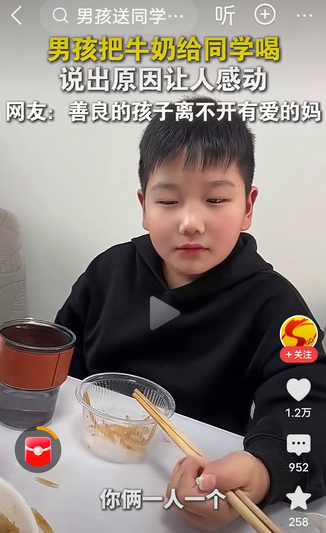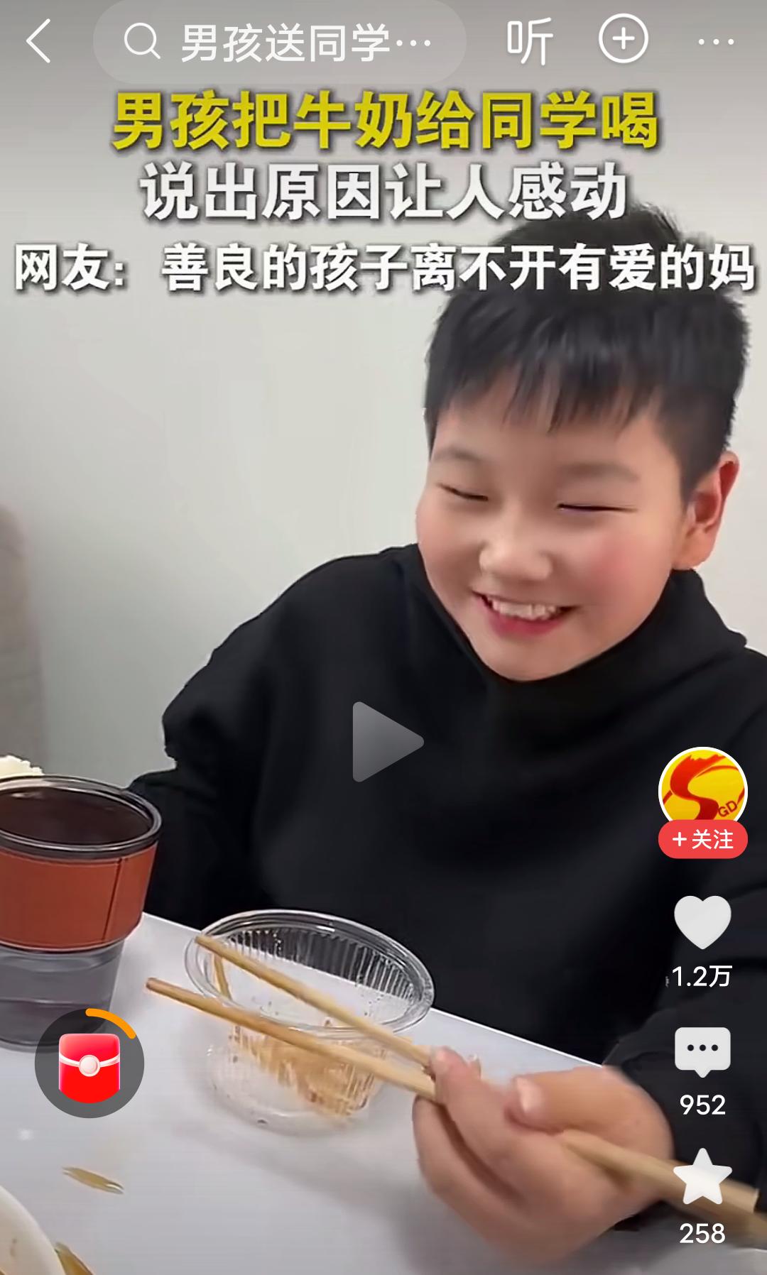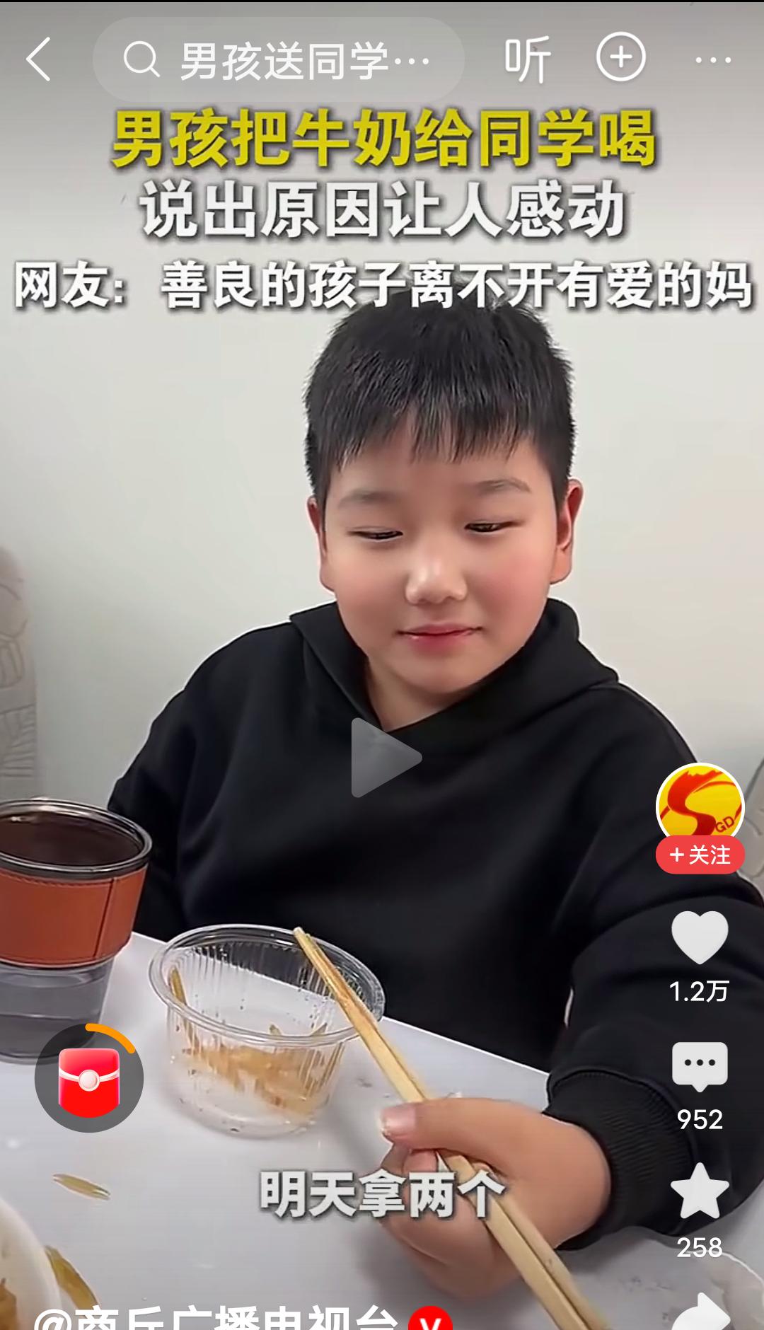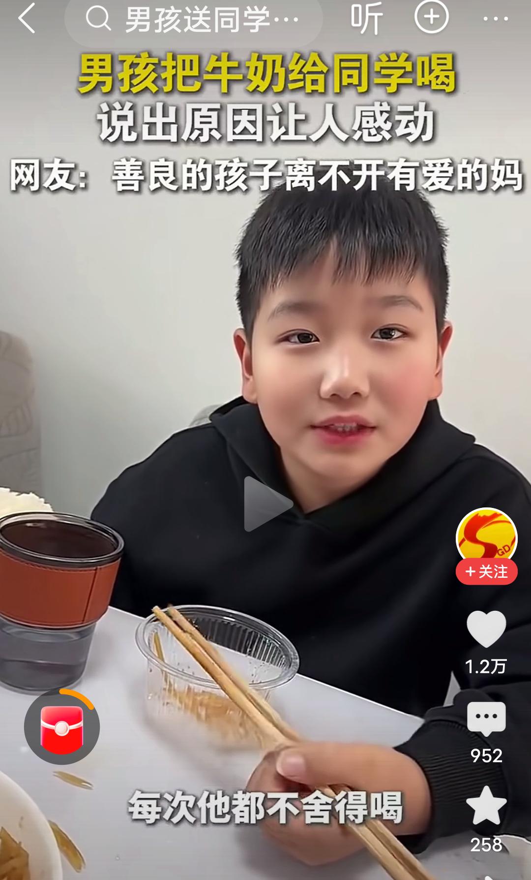 原生家庭的教育和成长环境真的很重要! 在河南,视频里的这个男孩,每天都把自己带的牛奶给同学喝,后来被妈妈发现了,当时不理解,说你别给你同学了,被人家妈妈知道了,多不好,结果这个男孩的一句话,“他没有妈妈”,瞬间让人泪目,妈妈也哽咽了,说那以后你拿两个吧,你俩一人一个。 男孩接着说,我管拿三个吗?妈妈有点纳闷,问为什么拿三个?男孩说,他还有个妹妹,每次他都舍不得喝,给他妹妹喝,妈妈连说管,管,管…… 河南人特有的管,管,管,管出了母爱的伟大,管出了母爱的无私,管出了母爱的奉献, 妈妈是孩子的第一任老师,母慈子孝,正是因为妈妈的善良,正是因为原生家庭良好的教育,才培养出如此善良有爱的男孩。 这个男孩满脸的善良厚道,足见一家满门的忠孝厚爱,言语之间全是爱与温暖。 良好的家教,懂事的孩子,真应了那句话:忠厚传家远,诗书继世长。