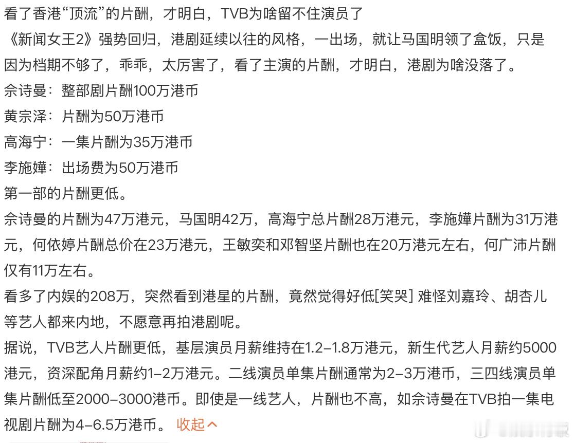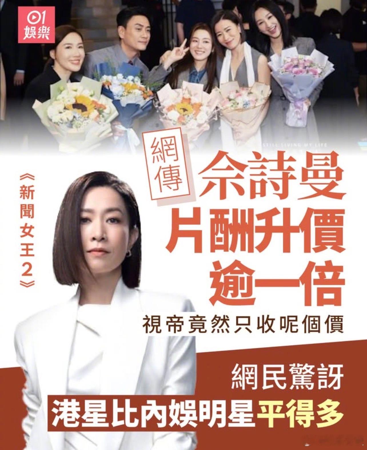 《新闻女王 2》正在热播,近日网上流传的一份演员片酬名单引发全网热议。名单显示,主演佘诗曼此次片酬 100 万港元。网传名单中,黄宗泽与李施嬅片酬持平,均为 50 万港元;高海宁则以 35 万港元位列其中。此外,第一季演员片酬也同步曝光,马国明 42 万港元、王敏奕 20 万港元、何广沛 11 万港元,整体低于第二季水平。昨日,黄宗泽与高海宁出席公开活动时,被媒体追问片酬传闻。高海宁以 “只负责赚钱,不算具体数额” 委婉回应,黄宗泽则直接 “甩锅” 佘诗曼,笑着表示:“总之她的片酬最高,其他的就别问啦”,幽默互动让现场氛围十分轻松,也间接印证了佘诗曼的高片酬传闻。