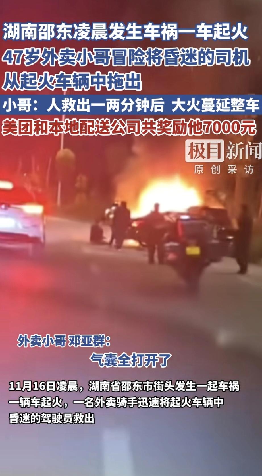 这名外卖小哥真是好样的!11月16日凌晨,湖南邵东发生车祸,一辆汽车起火。47岁的外卖小哥邓亚群路过,毫不犹豫冲上前,从起火车里拖出了昏迷的司机。 小哥说,把人救出来才一两分钟,大火就蔓延到整个车子,真的太险了!事后,美团和当地配送公司共同奖励他7000元,为他的勇敢点赞。 网友纷纷称赞:这才是真正的英雄,危难时刻挺身而出,挽救了一条生命!