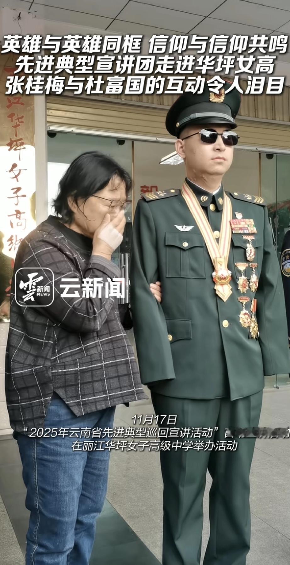 11月17日,在张桂梅老师创办的华坪女高,举办了一场特别感人的活动。“排雷英雄”杜富国和其他先进人物一起来到学校,和张老师进行了一场温暖的交流。 当双目失明、失去双手的杜富国出现在校园时,张老师像心疼自己孩子一样,轻轻扶着他。两位英雄,他们虽然岗位不同,但都有着同样坚定的信念——一个用生命守护国土,一个用一生托举女孩们的未来。 这场相见让在场所有人都湿了眼眶。他们让我们明白:真正的英雄,就是把平凡的事做到极致,用自己全部的力量去照亮别人。这样的精神,正在新一代年轻人心中生根发芽。