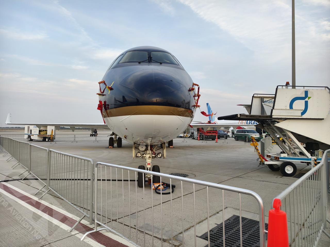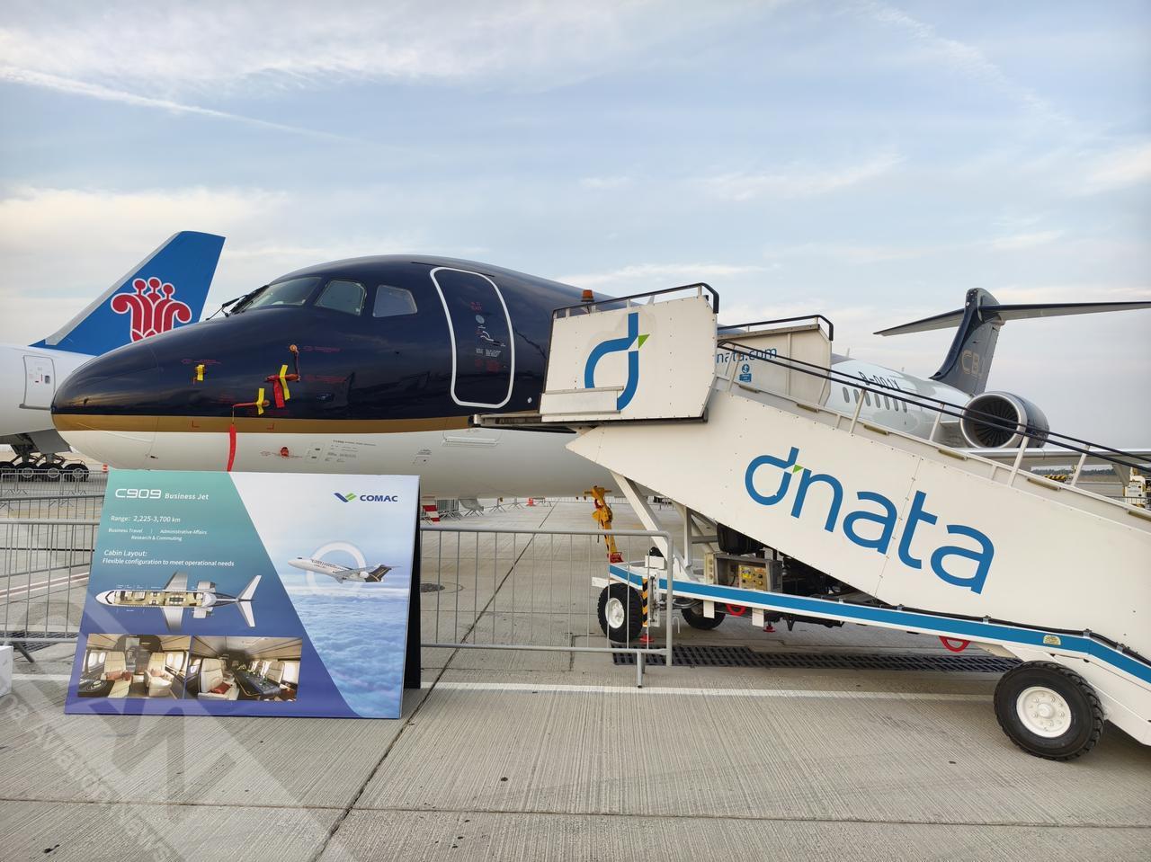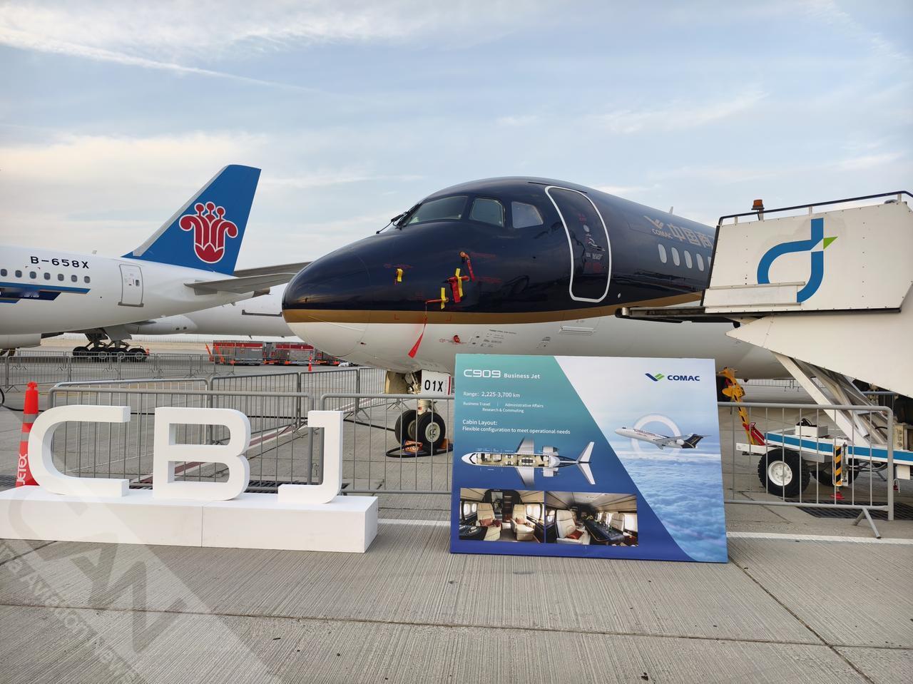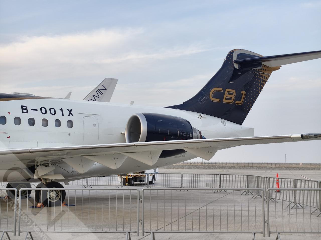 中国商飞CBJ公务机亮相2025年迪拜航展室外静展区。据悉,CBJ公务机是中国商飞在ARJ21支线客机基础上衍生的高端公务机型。(摄影:吴紫磨)