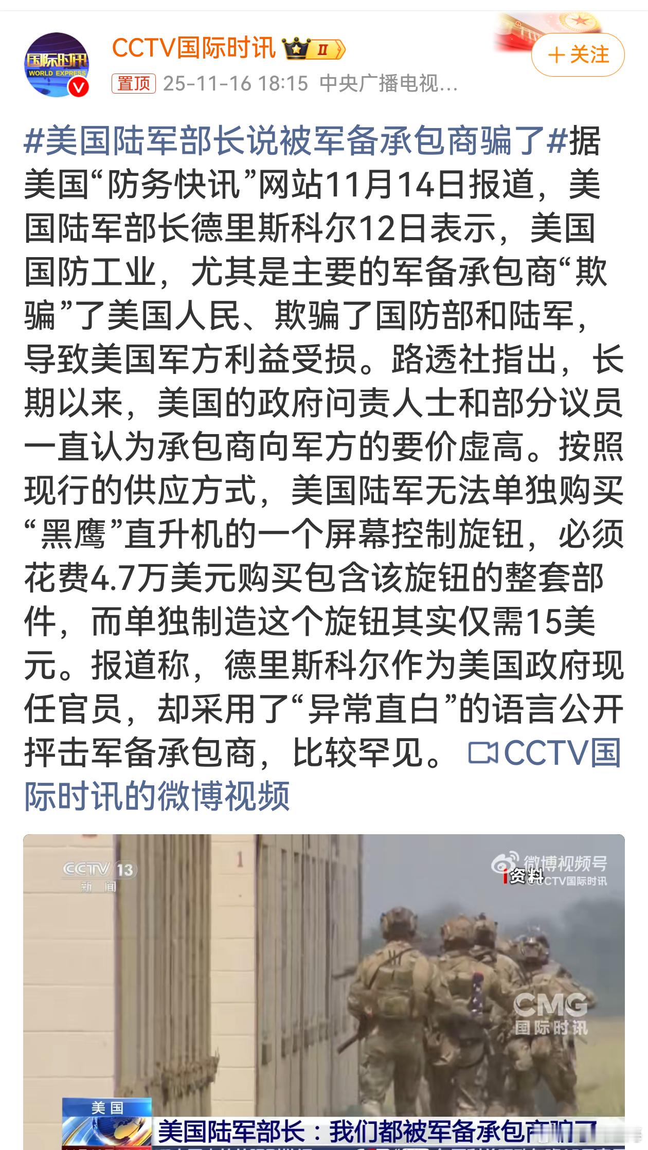 美国陆军部长直言军备承包商欺骗,道出了美国军方被敲竹杠的现实。要价虚高现象长期存在,像黑鹰直升机旋钮的离谱差价令人咋舌。官员罕见直白抨击,或反映军方对承包商积怨已久,也凸显美国军备采购体系弊病亟待整治。