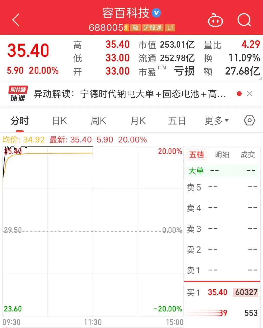 今天上午,容百科技集合竞价大幅高开,随后直线拉升,9:33左右,股价触及“20CM”涨停。