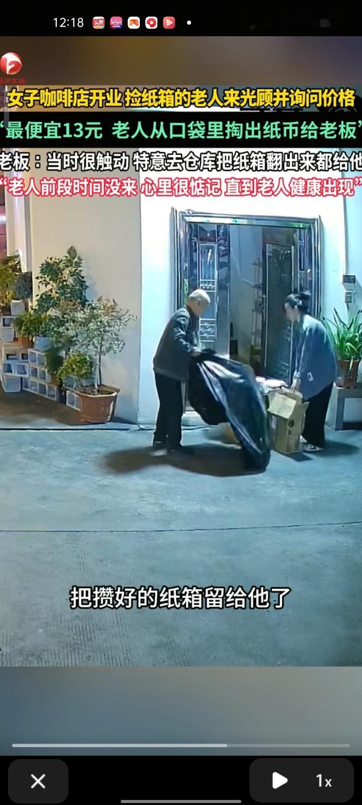 11月14日,泉州晋江市。咖啡馆开业,老板娘看见老人在附近捡纸箱,把店里的纸箱送给他后,他就询问咖啡的价格。老板娘告诉老人,最便宜的咖啡就13元,老人听后掏出13元纸币给她,'这让老板娘心里很触动。之后,老人每隔几天都来点一杯拿铁,老板娘习惯性的把纸箱留给他了,前段时间老人没来,老板娘心里一直惦记着,直到老人健康出现。