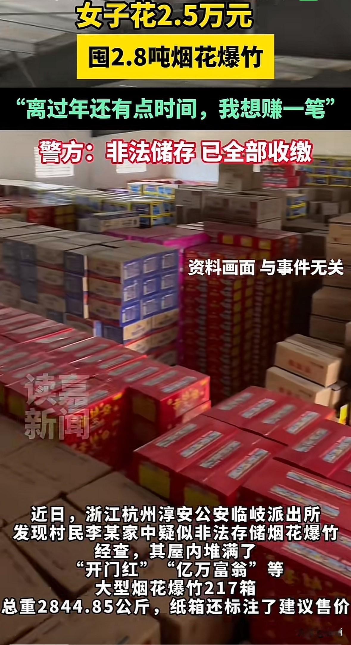 杭州淳安一位大姐花2.58万元囤了217箱、总重近2.8吨的烟花爆竹,想趁春节前赚差价,结果没办任何许可证被警方查处,烟花全被收缴还受了行政处罚。 这事看着是想赚点小钱,实则风险极大。烟花爆竹属于危险品,私自囤在家中就像藏了个“定时炸弹”,一旦出事不仅自己遭殃,还会危及邻里。而且按规定,经营存储烟花爆竹必须办许可证,无证操作本身就是违法的。 快过年了,不少人想着做年货生意,但再想赚钱也得守规矩。正规渠道、合法手续才是底线,别抱着侥幸心理触碰法律红线,安全和合规可比眼前的差价重要多了。