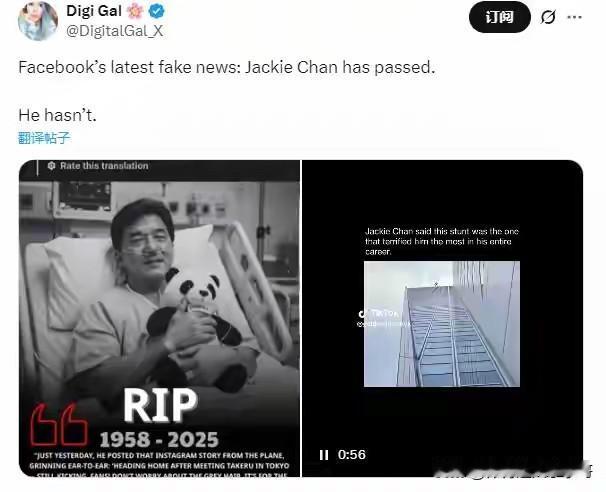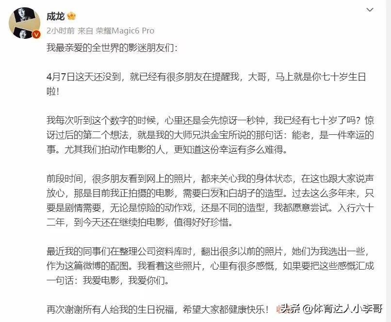 现在网上的谣言真的是不可救药,他们甚至传言成龙陈家驹先生因病去世了,这样的谣言在好几年前就出现过,我不知道他们为什么会说成龙去世了,甚至说李连杰去世了,还说过赵本山被抓了,什么样的谣言都有,我们的国家对于网络谣言也进行过沉重的打击,之前还拘留过制造谣言的人,但是这些人还是屡教不改,成龙大哥自己亲自来澄清,说的他活的好好的,因为他11月11号他导演的过家家还即将上映的,他可能还出席首映礼,希望大家不要胡胡说八道,因为这样的话等于等于是诅咒他,成龙大哥在在华人世界有这么大影响力,为我们国家争了这么大一口气,争得了这么多荣誉,我们应该期待他活的更长久一点,而不是希望他早点离开!