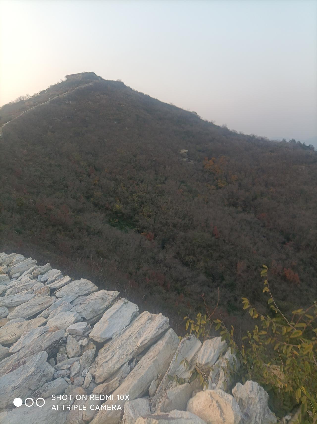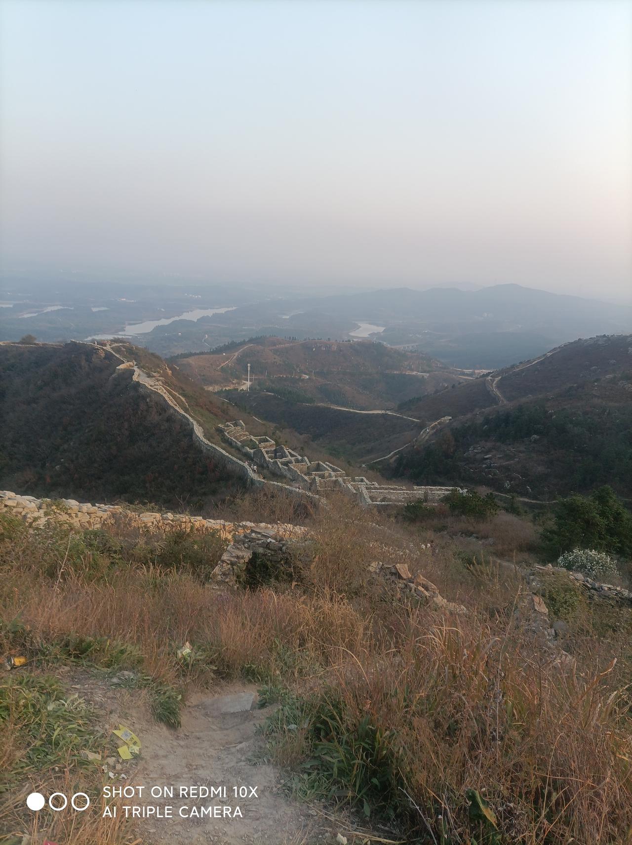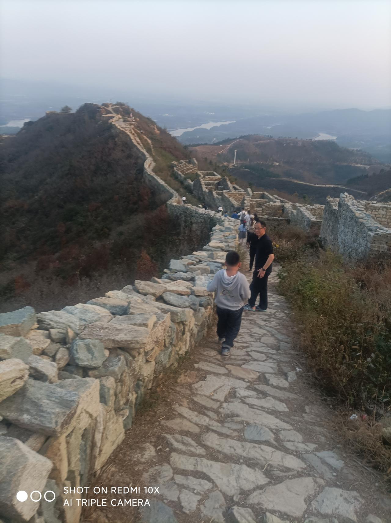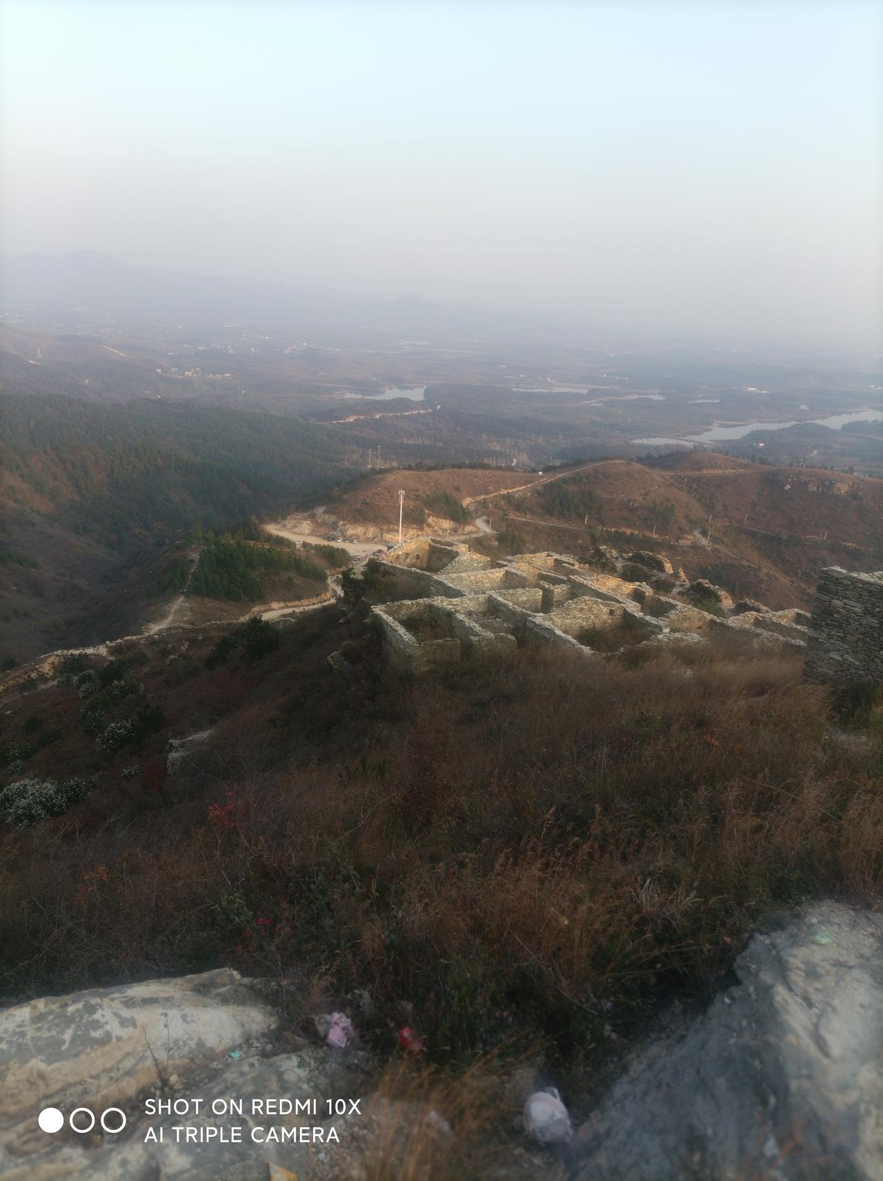 鲜为人知的武汉古长城一一 昨天下午1点,堂弟自驾车带我从汉口出发,经过1小时30分钟行驶,到黄陂城北李集街程岗村古寨遗址(又叫永安寨)蹬山游览。 景地是武汉市黄陂区一处保存较完好的明清古寨遗址。 蜿蜒雄伟的石砌城墙盘踞于山脊顶上,被称之为“武汉小长城”。已被列为湖北省文物保护单位,是当今游人户外徒步健身、观光、感受历史保留原物原形原境的独有风貌! 龙王尖山海拔385、6米,山顶城墙始建于明宣德二年(1427年),到清咸丰年间大规模扩建,同治七年(1868年)完全建成。 工程宏伟庞大气派,总占地面积1、5平方公里,寨墙周长约12公里,平均墙高3、5米;现遗存寨内残留1200多间石板屋基墙,房间布局巧妙合理,清析可见。 4点我们开始澄山,因是礼拜天,游人很多。 龙王尖山不算高,但是比较徒峭;蹬上半山腰,己是喘着大气、汗流满身,只有稍停步歇一下,回头看看山外风光,视野开阔、美景如画!山中已是层林尽染;山外远景河流、湖泊、高山映入眼帘,壮观、美丽、一饱眼福! 上到最高顶峰,都己喘着粗气汗流夹背。 遥看山外、山下风光,犹如仙境。 近处的各山寨石墙全收眼底;山脊的城墙犹如一条巨龙蜿蜒起复而卧、气势滂沱!远处的木兰山脉、旗司顶峰映入眼帘;碧蓝的木兰湖水清析可见! 完全体验印证了站得高、看得远的学说,真是一种至“高"无尚的享受! 山上一个多小时的观光游览,开阔了眼界、琢展展了视野! 5点多钟,太阳落山了,我们也欢心开心舒心乐意地下山返回,过上了一个难忘的周未!
