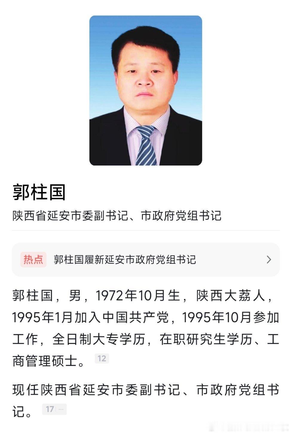 郭柱国已任延安市委副书记、市政府党组书记。