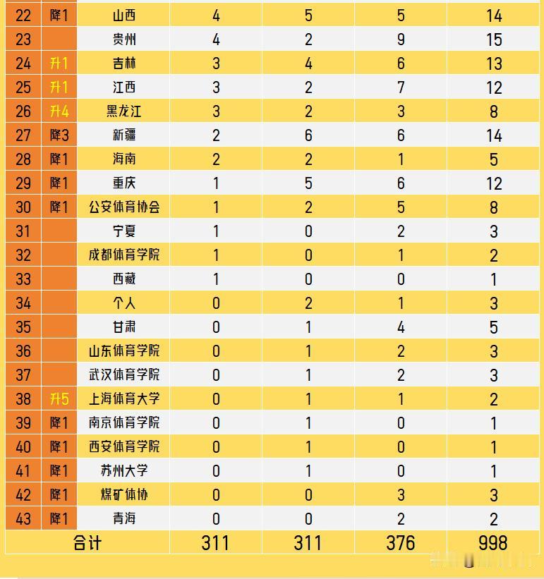 【粤鲁奖牌双破百!24小时内49项决出胜负,游泳田径武术散打是主力!】 截止11月17日12时30分,第十五届全运会共计产生包括311枚金牌在内的998枚奖牌。 昨天中午至今天中午共计49个项目决出胜负,广东斩获三金两银两铜,山东斩获三金六银五铜,两队金牌只差一枚,总奖牌数差五枚。 昨晚,浙江和江苏的竞争一度白热化,今天,浙江再度拉开差距,稳居金牌榜和奖牌榜双榜第三。 香港、湖南、天津、云南、黑龙江和上海体育大学上升势头迅猛。斩获五枚金牌及以上的团体增至21个。