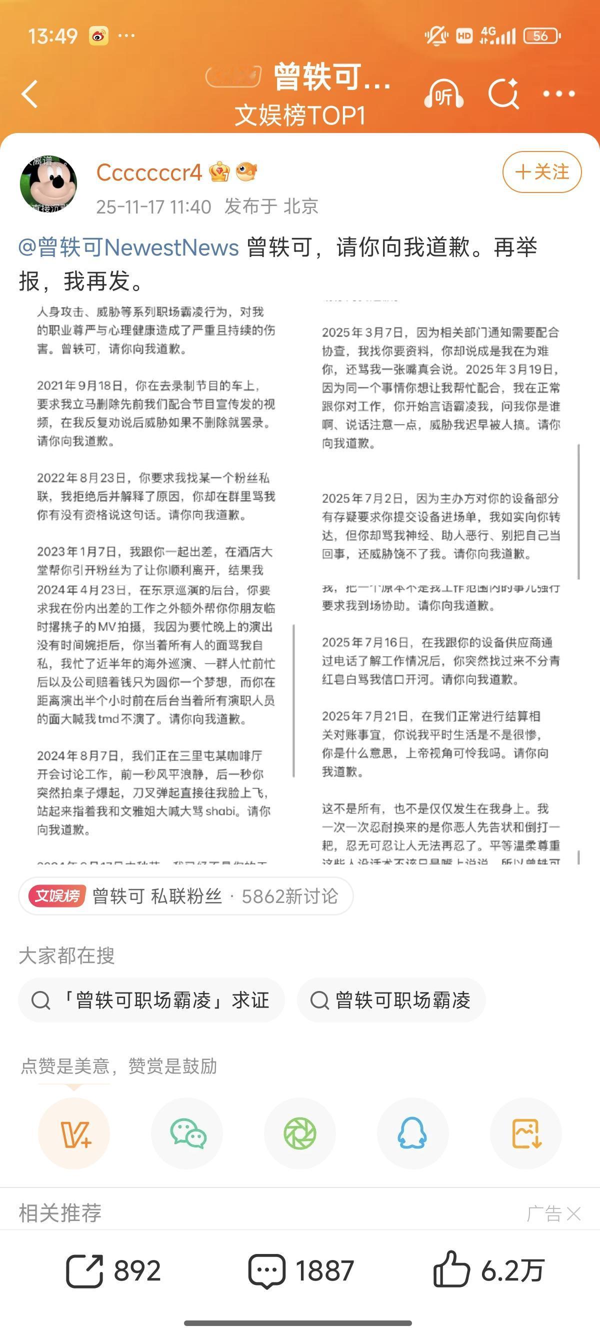 娱乐圈又现职场争议!前工作人员晒长文列细节,现任助理发文回应,多方声音引发网友关注~ 近日,曾轶可前工作人员通过社交平台发布多条内容,提及2021年至2025年期间的工作相关争议,包括工作沟通中的分歧、加班安排争议等情况,同时晒出部分沟通记录作为佐证。随后,曾轶可现任助理在朋友圈发文回应相关话题,双方的不同表述让事件引发热议。 •2024年三里屯开会,突然拍桌震飞刀叉,餐具直飞员工脸 • 结算工资嘲讽“你生活很惨?还敢可怜我?” 除了职场相关争议,曾轶可近期的巡演也受到关注。有网友晒出部分场次的售票数据,部分高价票销售情况不佳,同时有观众反馈演出内容与宣传预期存在差异,引发讨论。 据悉,曾轶可此前曾因机场边检事件引发舆论关注,此次再度因多方争议成为焦点。截至目前,曾轶可本人及工作室尚未针对此次前员工的控诉作出正式回应,事件具体情况仍有待进一步核实。 职场相处中的沟通与尊重、公众人物的职业口碑,都是网友关注的话题。理性看待各方声音,等待更多信息披露才是关键~ 温馨提示:本文内容基于公开网络信息整理,仅作客观呈现,不代表任何立场,请勿轻信单一信源,理性讨论。曾轶可