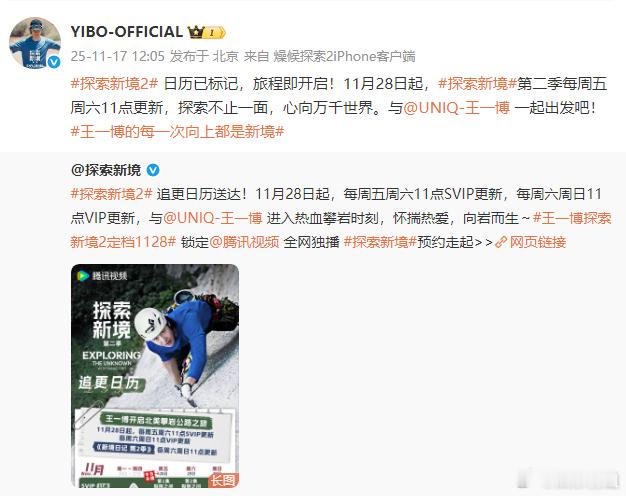 王一博日历已标记,旅程即开启!11月28日跟着王一博,探索世界!!将热爱做到极致!