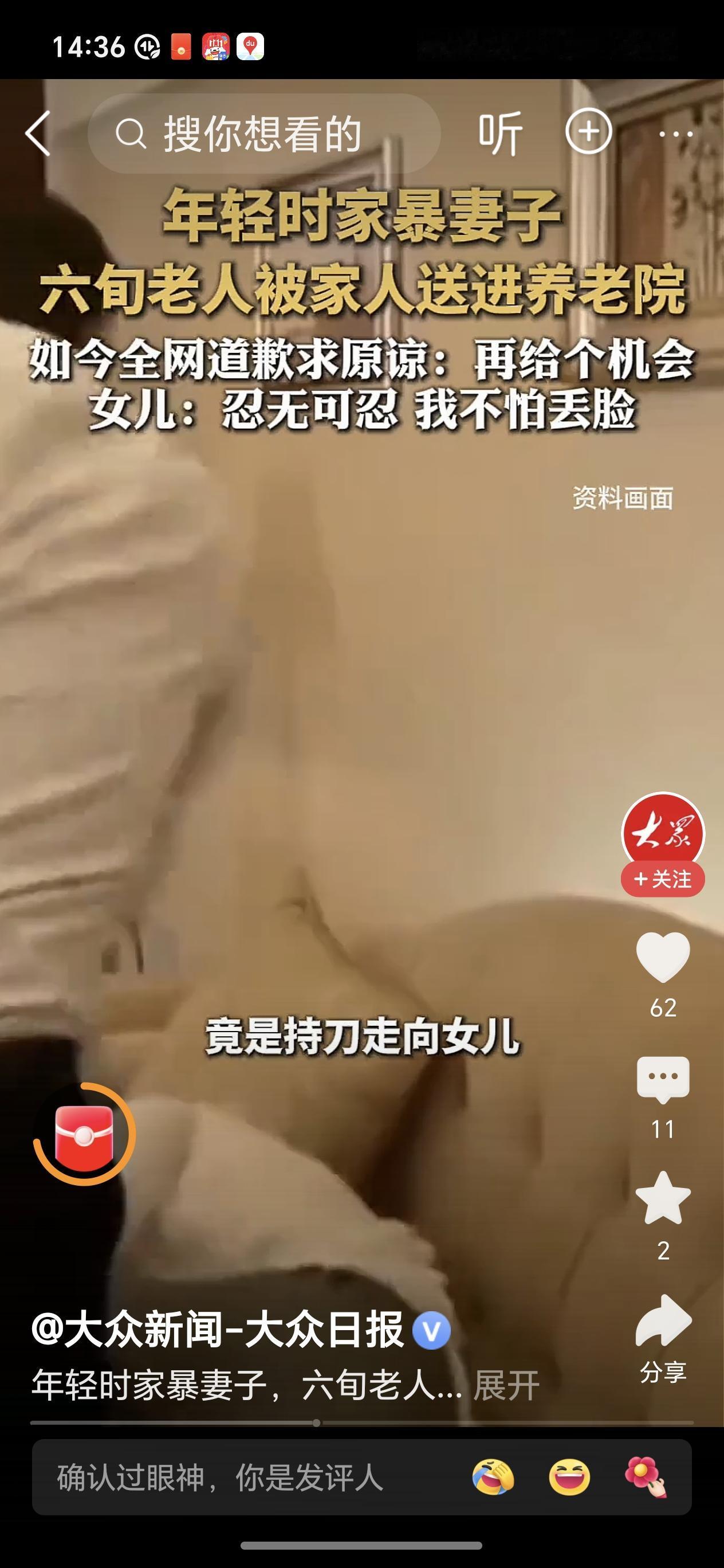 男子家暴妻子多年 年老后道歉求原谅 河南许昌一位6旬老人被妻女送进养老院,真是让人唏嘘。 原因是年轻时他经常家暴妻子,女儿记事起就看着他拿酒瓶子砸母亲头,还扬言弄死妻女。如今他坐着轮椅,和妻子拌嘴后被送进养老院,退休金也从600降到300,女儿还用棒球棍砸他轮椅。 他委屈地说自己能改,想回归家庭。但伤害已经造成,女儿回忆起他持刀走向自己的场景,早已心寒。 种瓜得瓜种豆得豆,他现在需要妻女了,可曾经他施暴时想过家人感受吗?家暴只有零次和无数次,他的道歉,妻女是否原谅,都能理解。