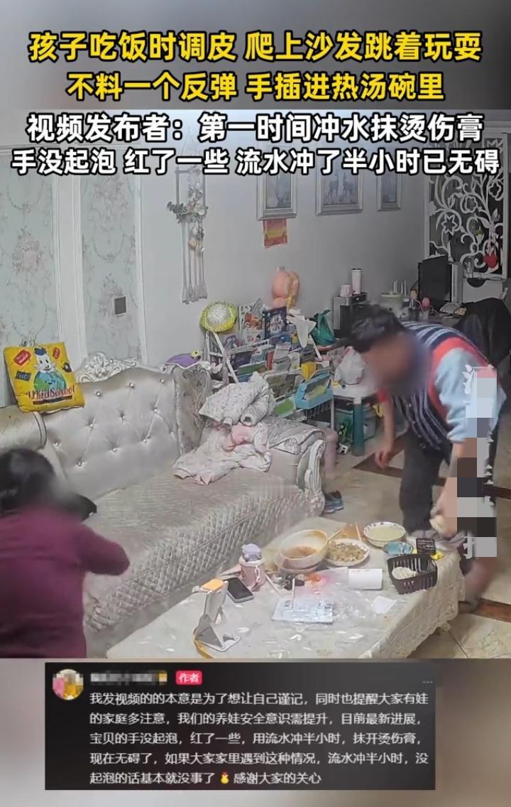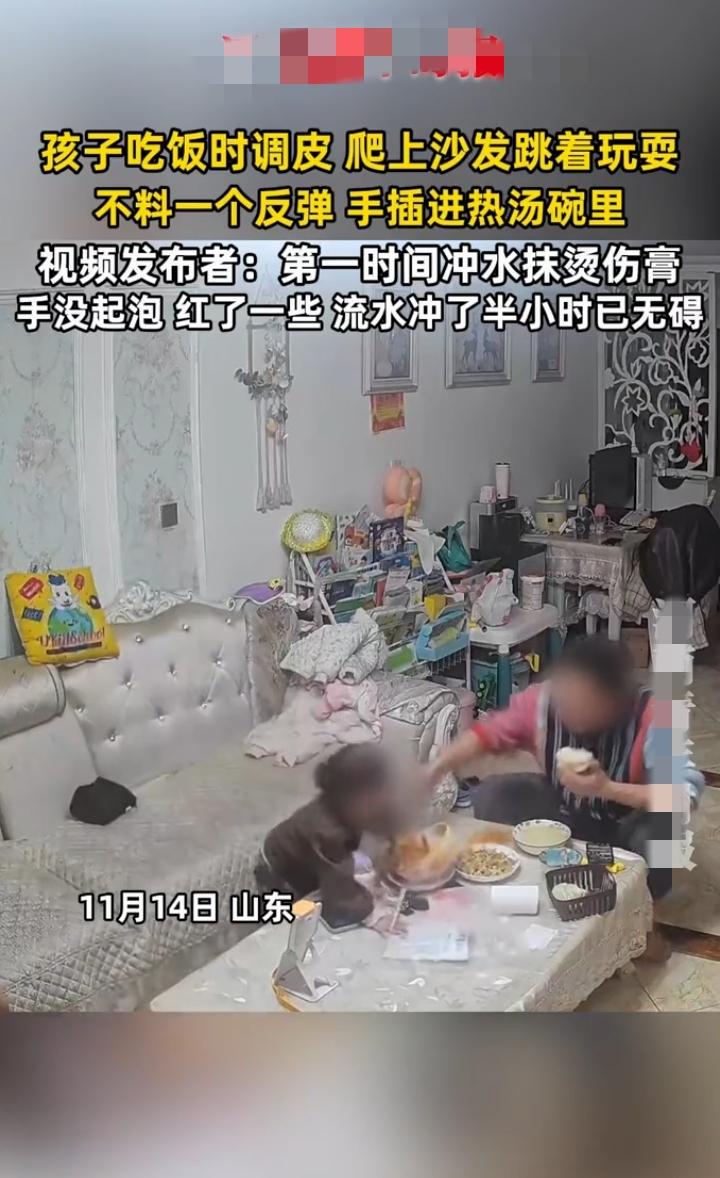 近日山东临沂,一4岁孩子在客厅吃饭,期间跳上沙发玩耍,谁料,沙发一个反弹,孩子的手直接插进了热汤里面! 家长看到后,心里一紧,赶紧过去查看情况,直接用流水给孩子的手指冲洗了半个小时,然后再涂抹烫伤膏,现在孩子的手指没有什么大碍了,只是红了一些,多几天应该会好!家长也是提醒有孩子的家庭,特别是比较调皮的,要多注意照看孩子,以免发生类似的事情!